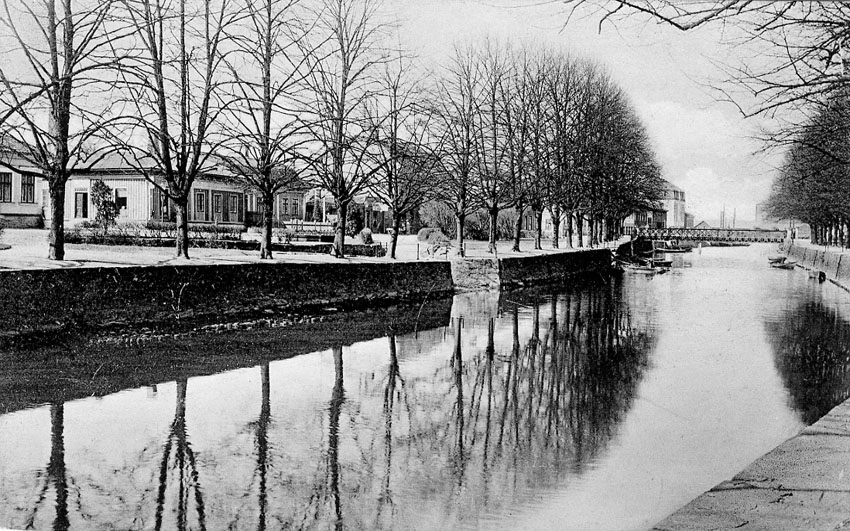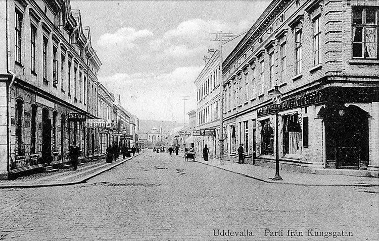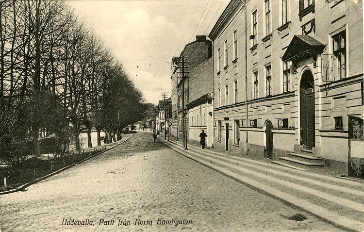 Tryckt text på vykortets framsida: "Uddevalla, Parti från Norra Hamngatan."