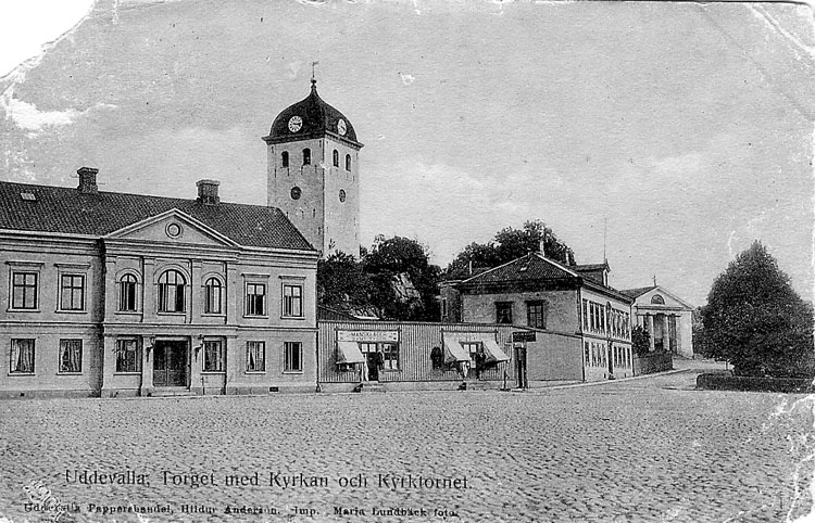 Tryckt text på vykortets framsida: "Uddevalla Torget med Kyrkan och Kyrktornet".
