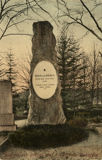 Tryckt text på vykortets framsida: "Wilhelm von Brauns graf å Uddevalla kyrkogård."