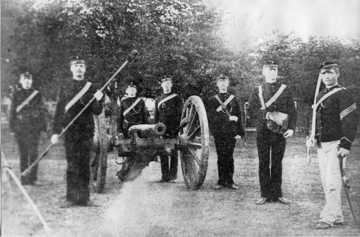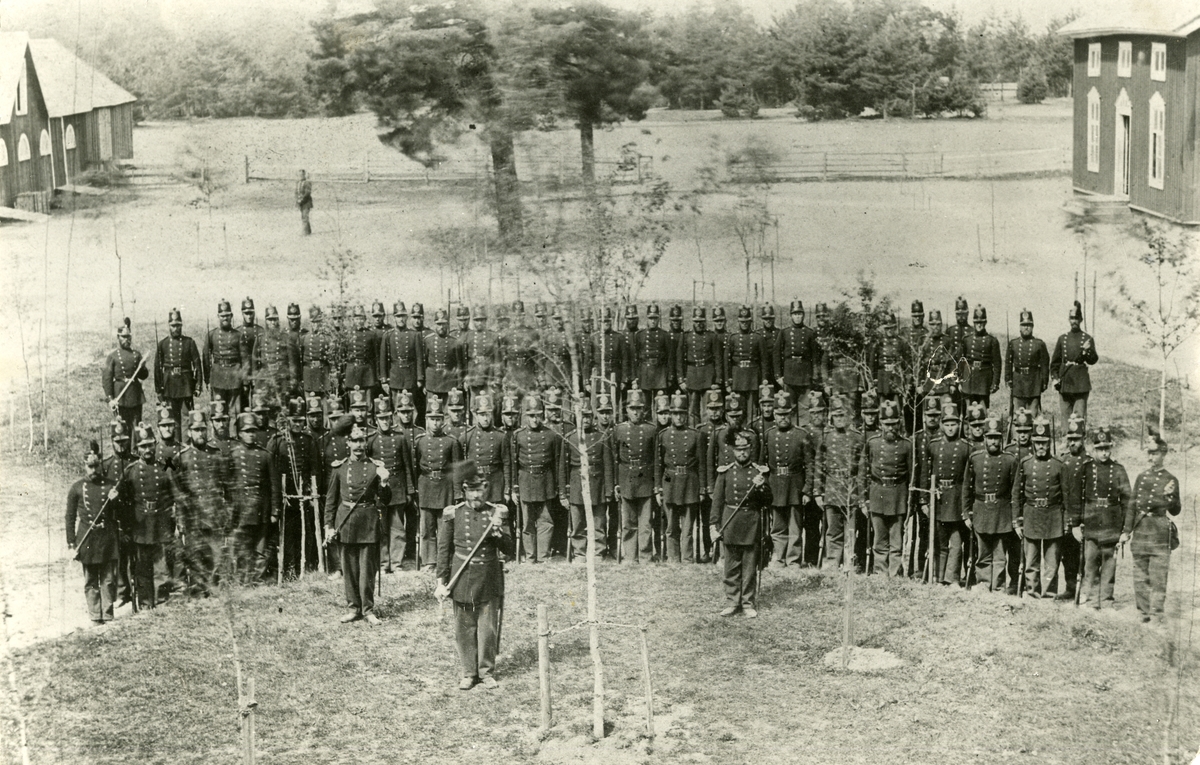 14 trupp vid Hälsinge regemente I 14 stående på gårdsplan med nyplanterade Björkar.
