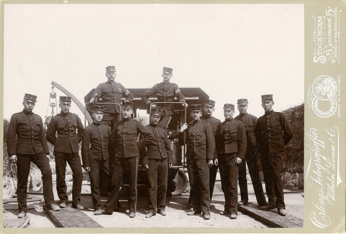 Soldater vid Vaxholms grenadjärregemente I 26 framför fästningskanon.