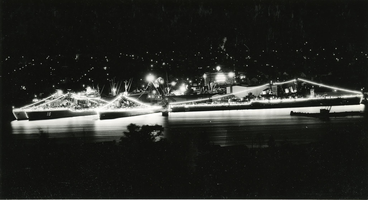 Kryssaren Tre Kronor samt Ölandtyp och Hallandtyp jagare besöka Bergen på 1950 talet.(1957). "Operation Nordkust".
