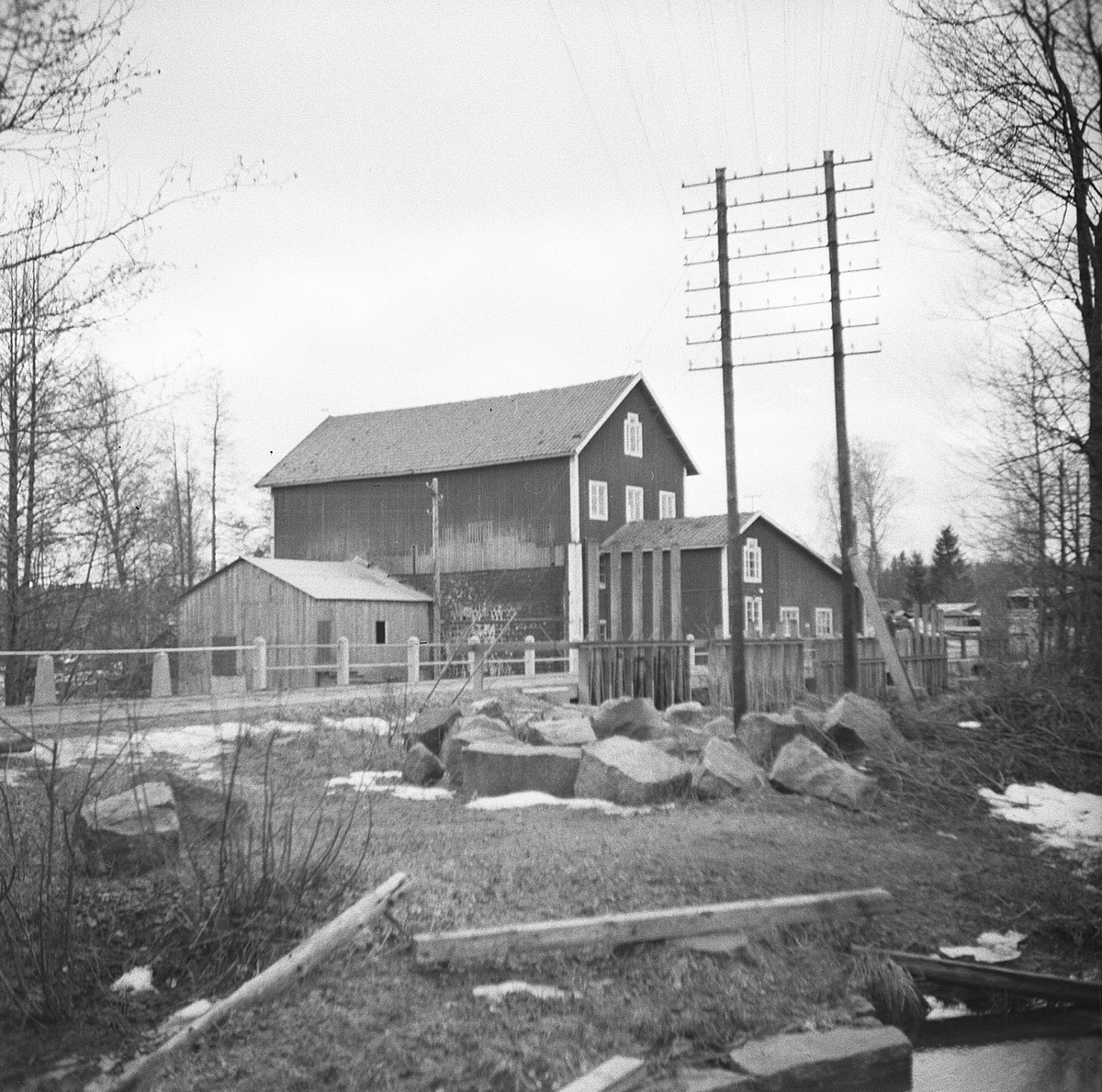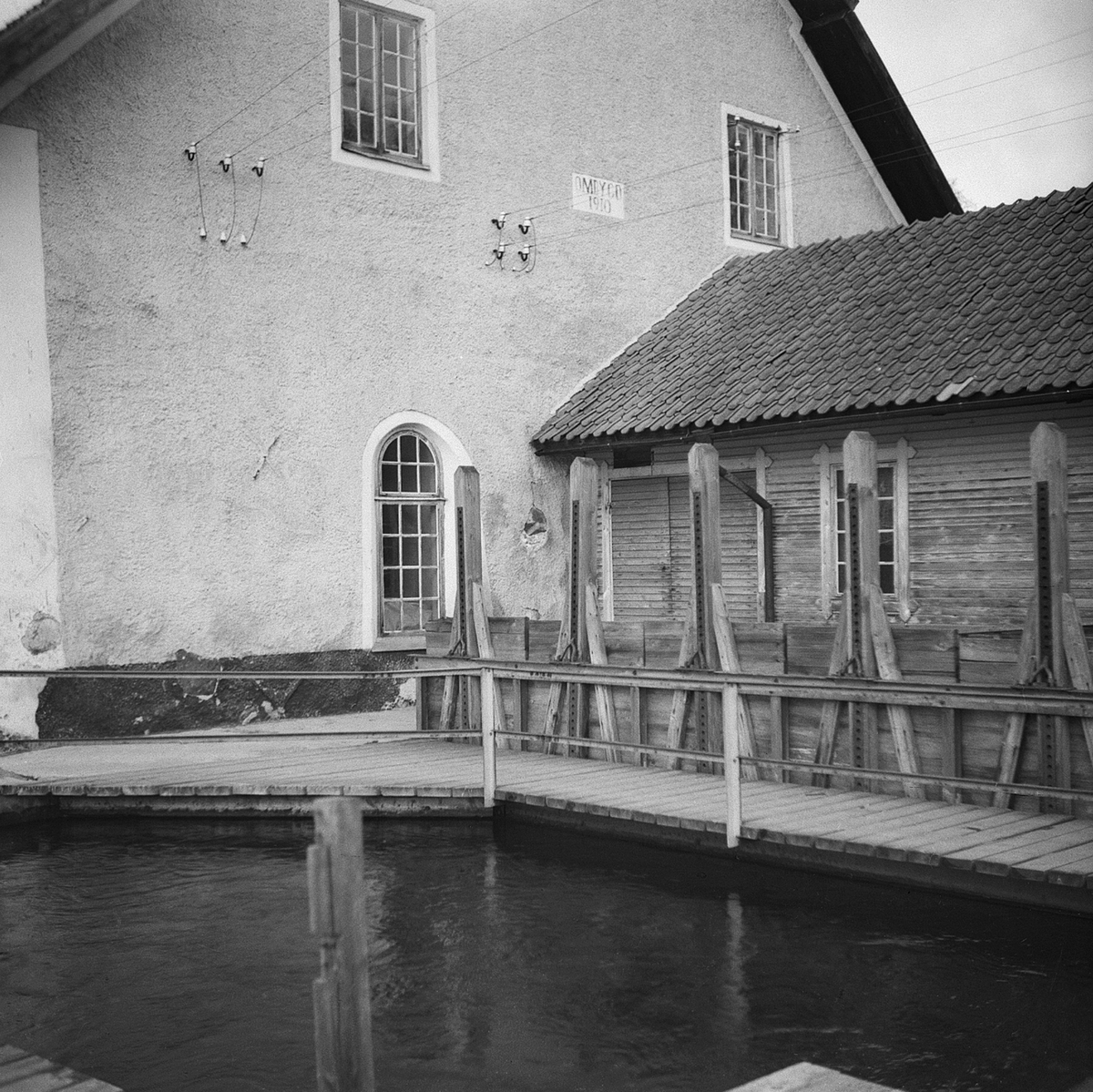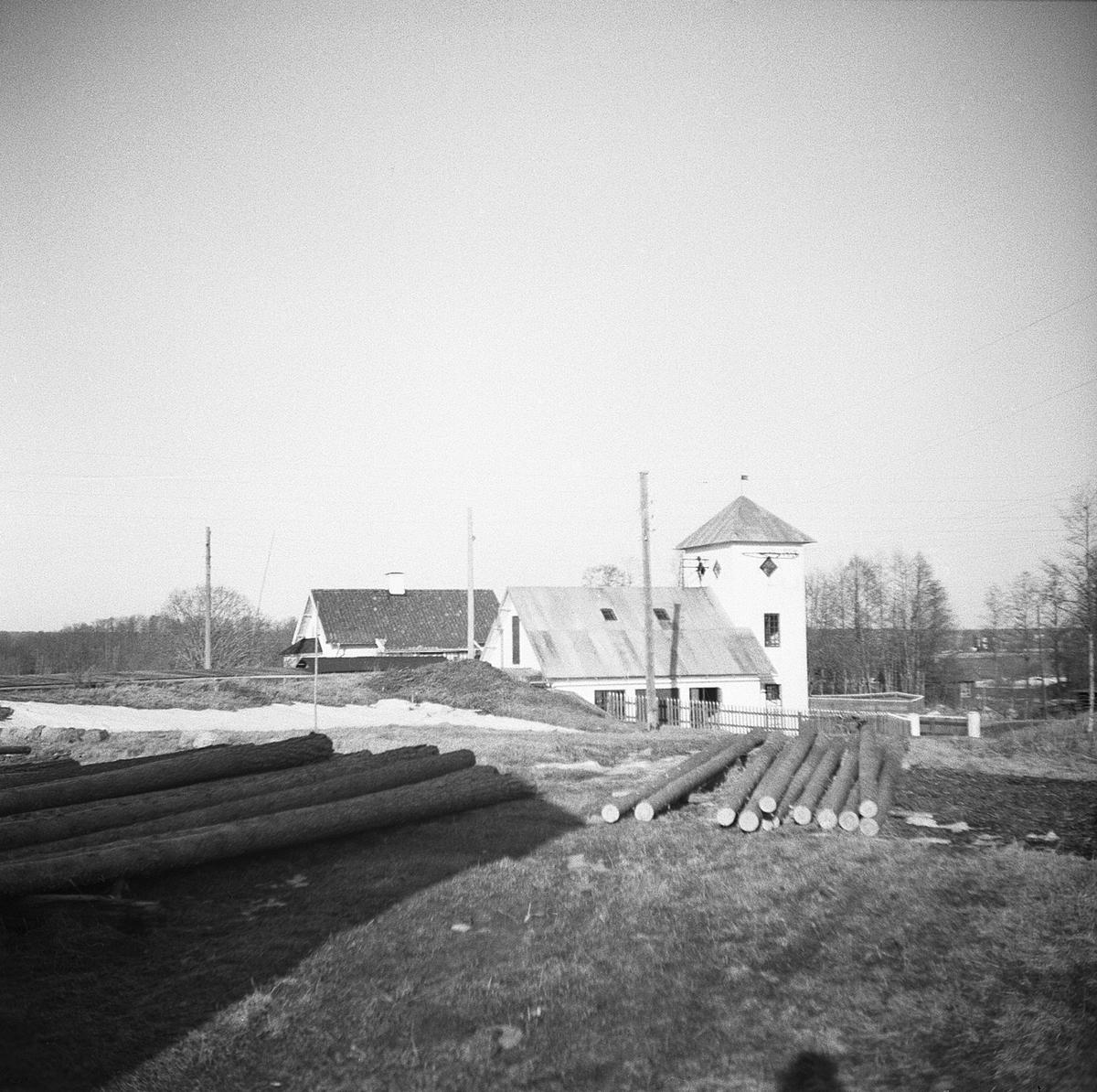 Nyköpings elektricitetsverk. Elektricitetsbyggnader och timmer iförgrunden.