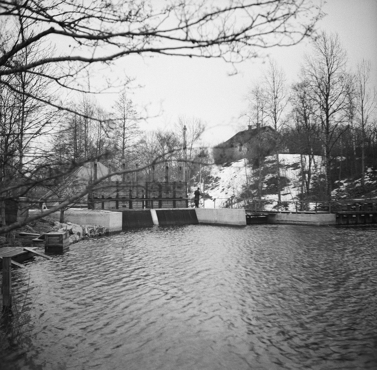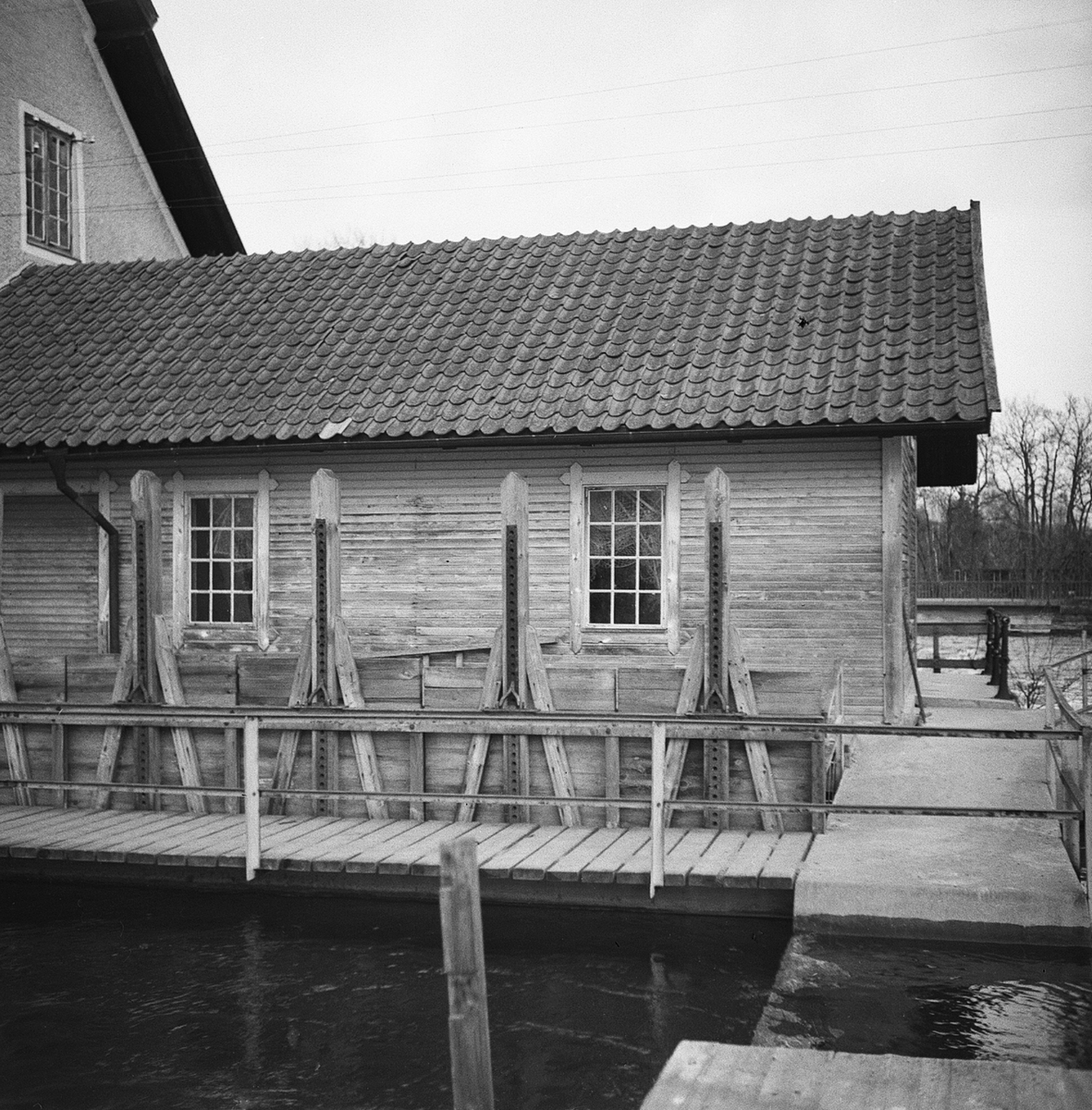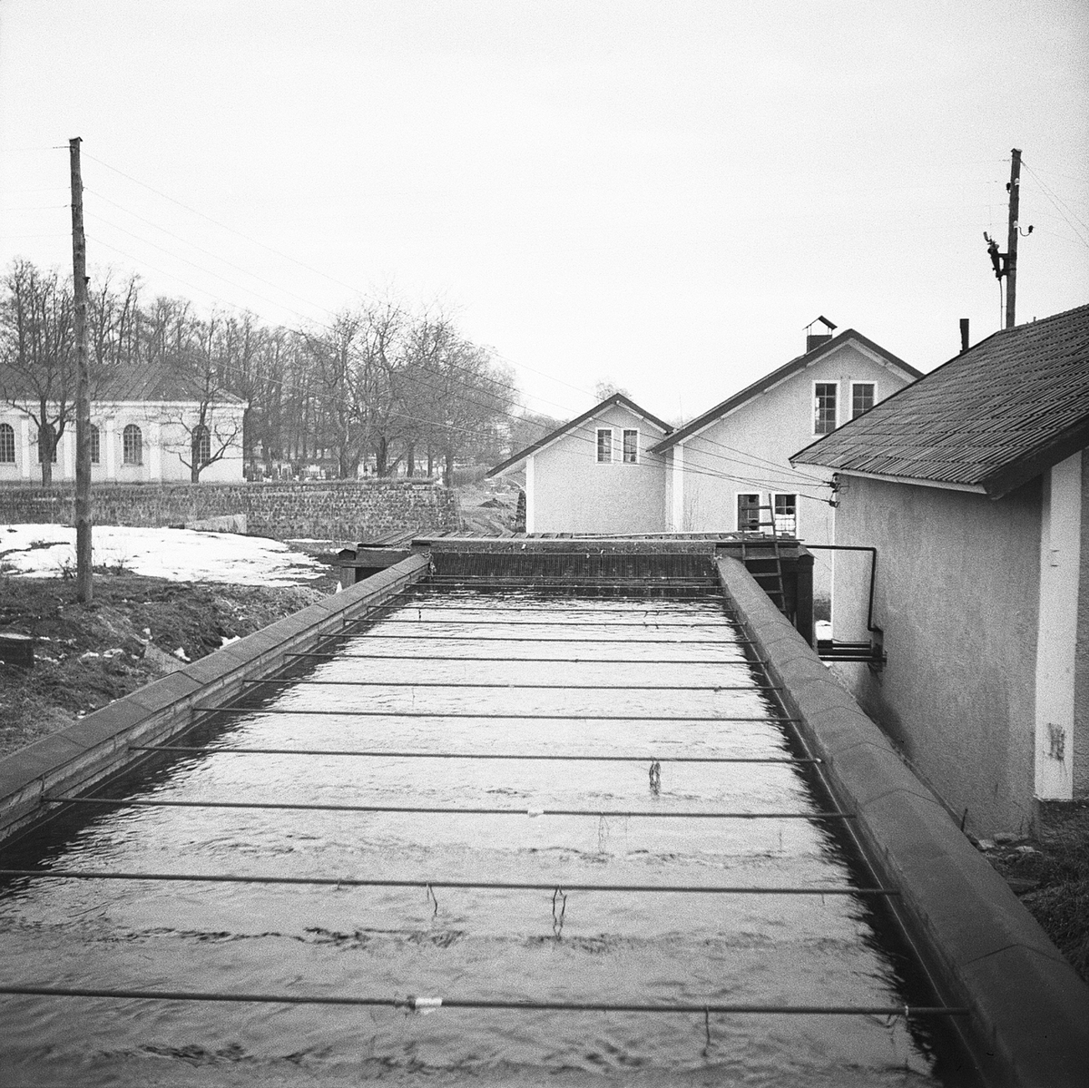 Nyköpings elektricitetsverk. Elektricitetsbyggnader och timmer iförgrunden.