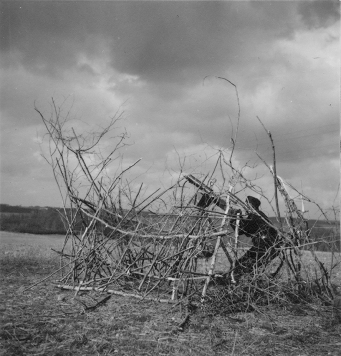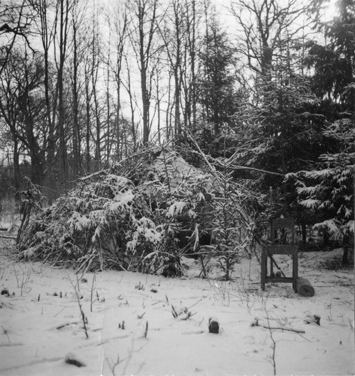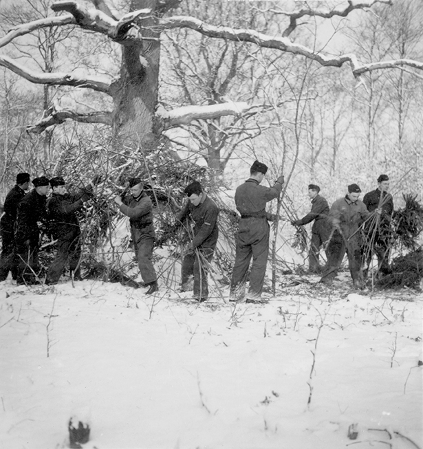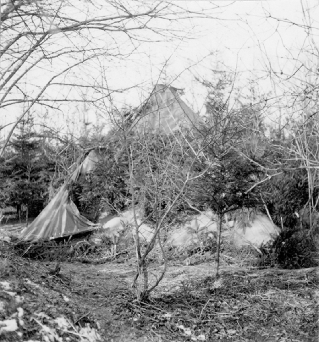 Kamouflering av bivack, nattläger. Fem soldater i kamouflagearbete. Under övning "Skånemanövern", 1939.