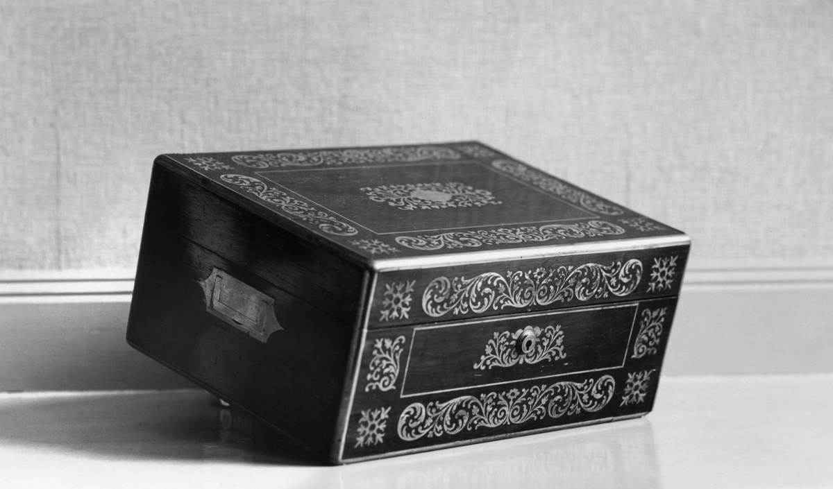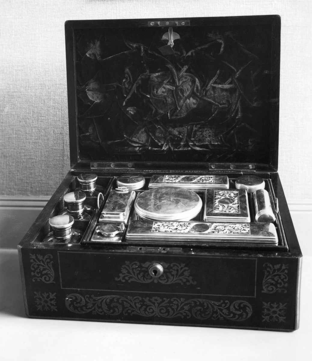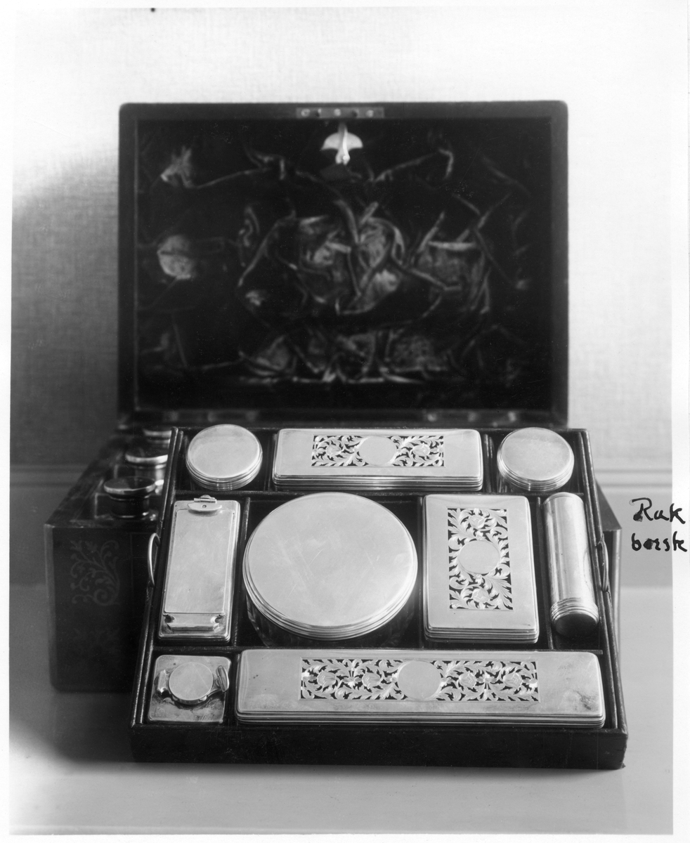 Schebo schatullet, samma föremål med öfversta lådan uttagen och ställd lutande mot schatullet.