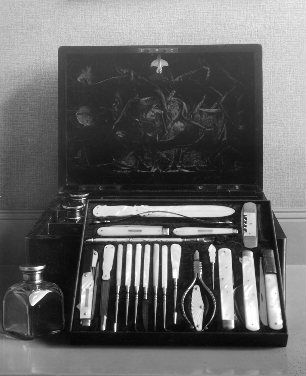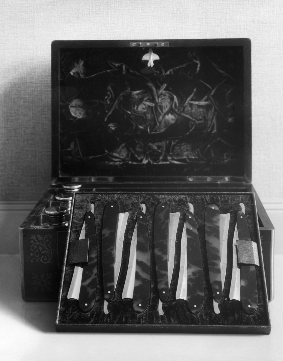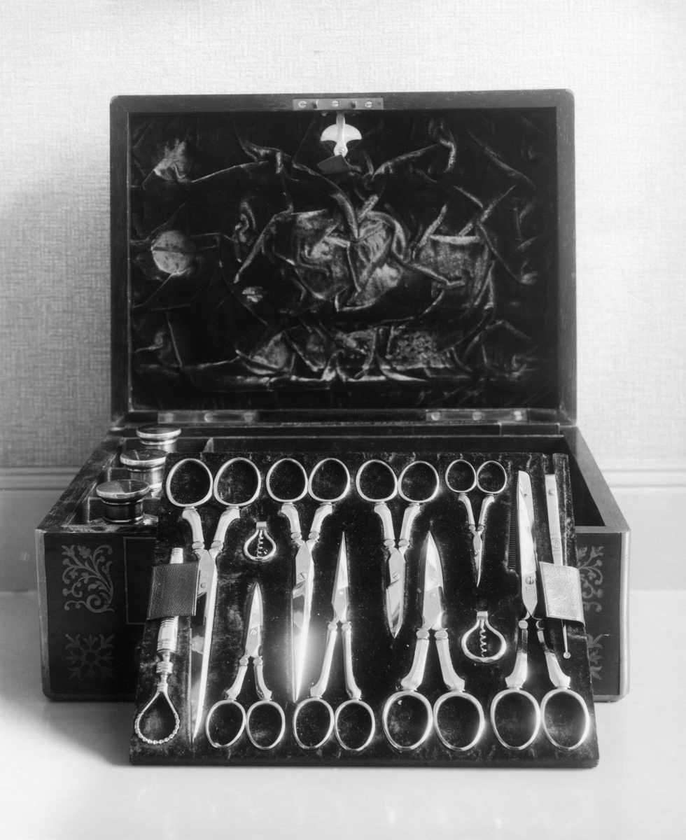 Schebo schatullet, samma föremål med öfversta lådan uttagen och ställd lutande mot schatullet.