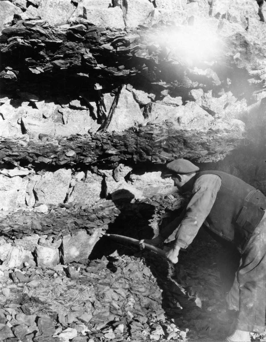 Aktiebolaget Gullhögens Bruk. Lossbrytning av bränd kalk ur fältugn med ugnskrok.
