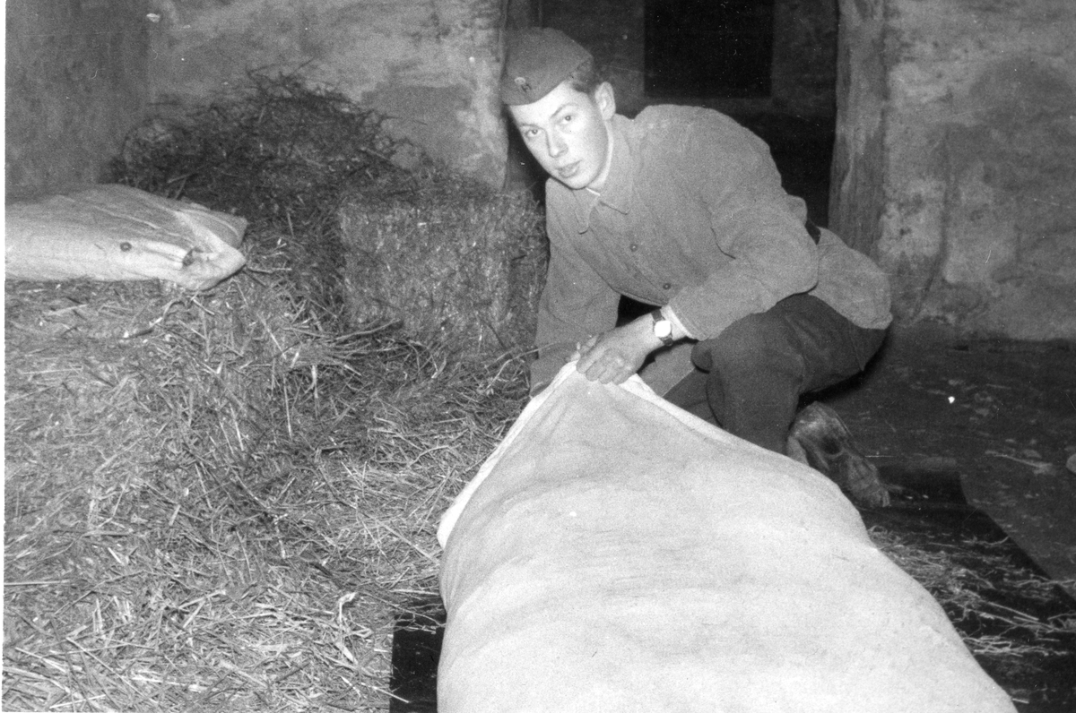 Värnpliktige fyller madrassen med halm i källaren på Göta artilleriregemente A2.