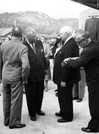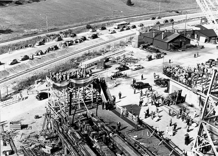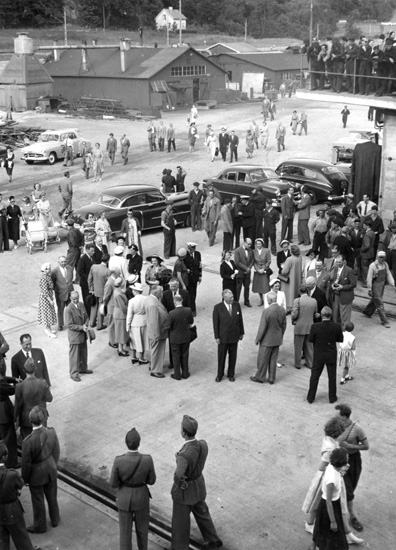 Vid dop och sjösättning av fartyg 124 M/T Astrid Elisabeth. Kvinnan med blombuketten är fartygets gudmor som just döper fartyget.
