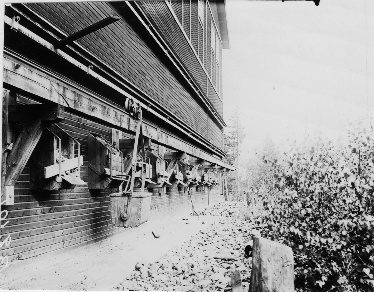 Hagfors bruk. Elektriska hyttan. Husen av rött tegel. Stora huset med tegeltak. Små husen med svart papptak, dörrarna mörkröda, rött staket. Fabriksskorstenarna av rött tegel.