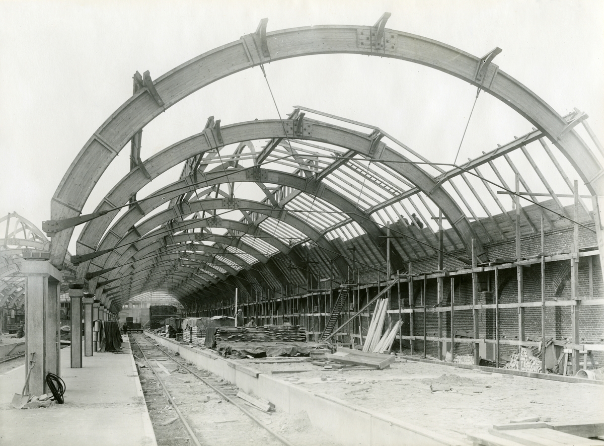 Byggandet av banhaller i Malmö. Tillverkad av AB Fribärande Träkonstruktioner i Töreboda.