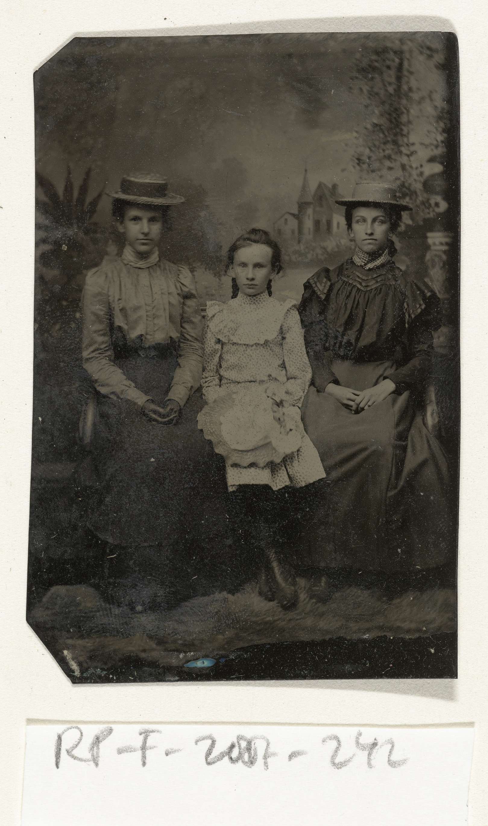 Portret van twee vrouwen en een meisje, zittend in een atelier met geschilderd achtergronddoek,