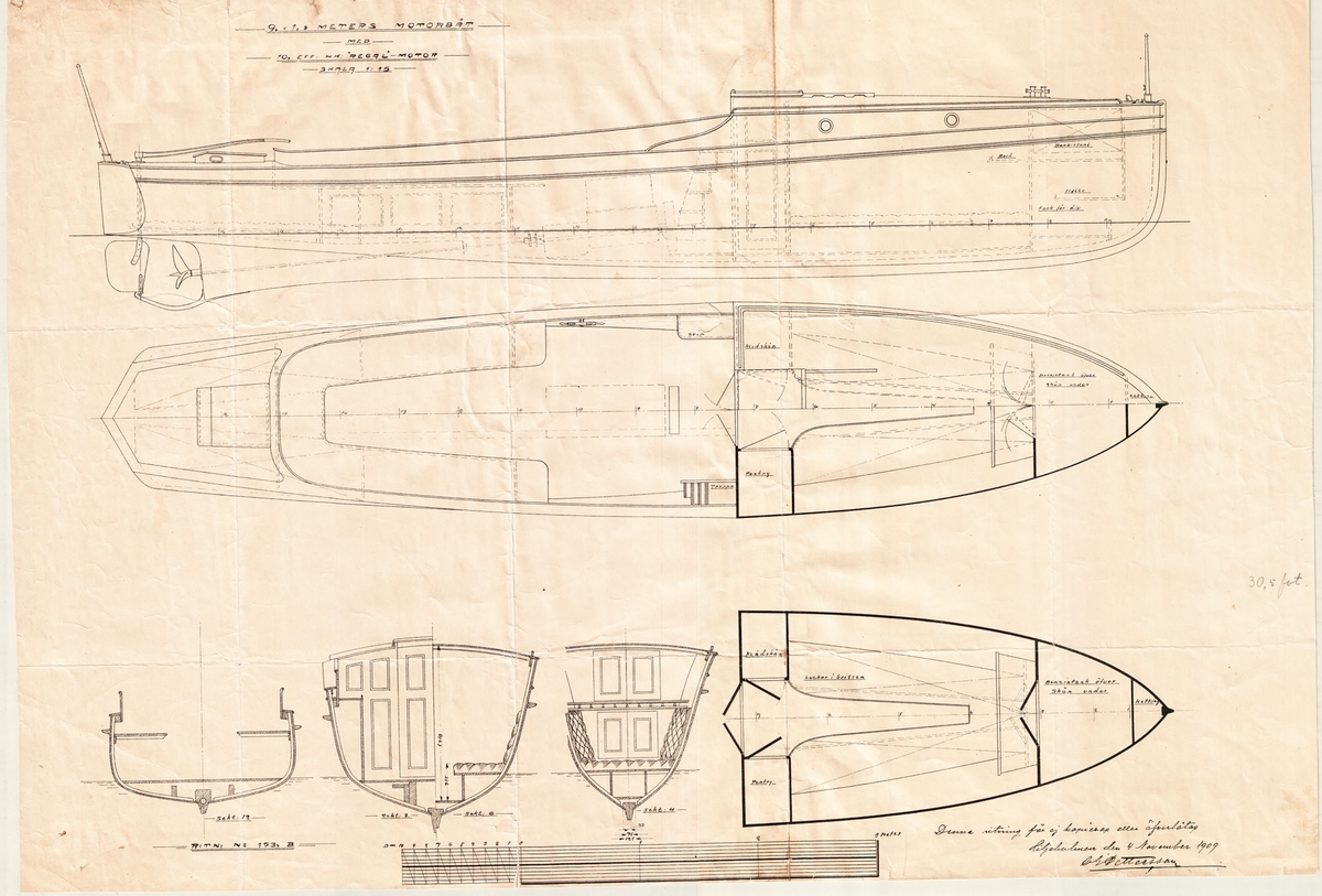 51ft Mud Boat (1815). Scale: 1:24. A plan showing the body plan, sheer lines, and longlitudinal half-breadth for a fifty-one foot, fifty-five ton mud boat, as built in 1815, and with later proposed modifications.