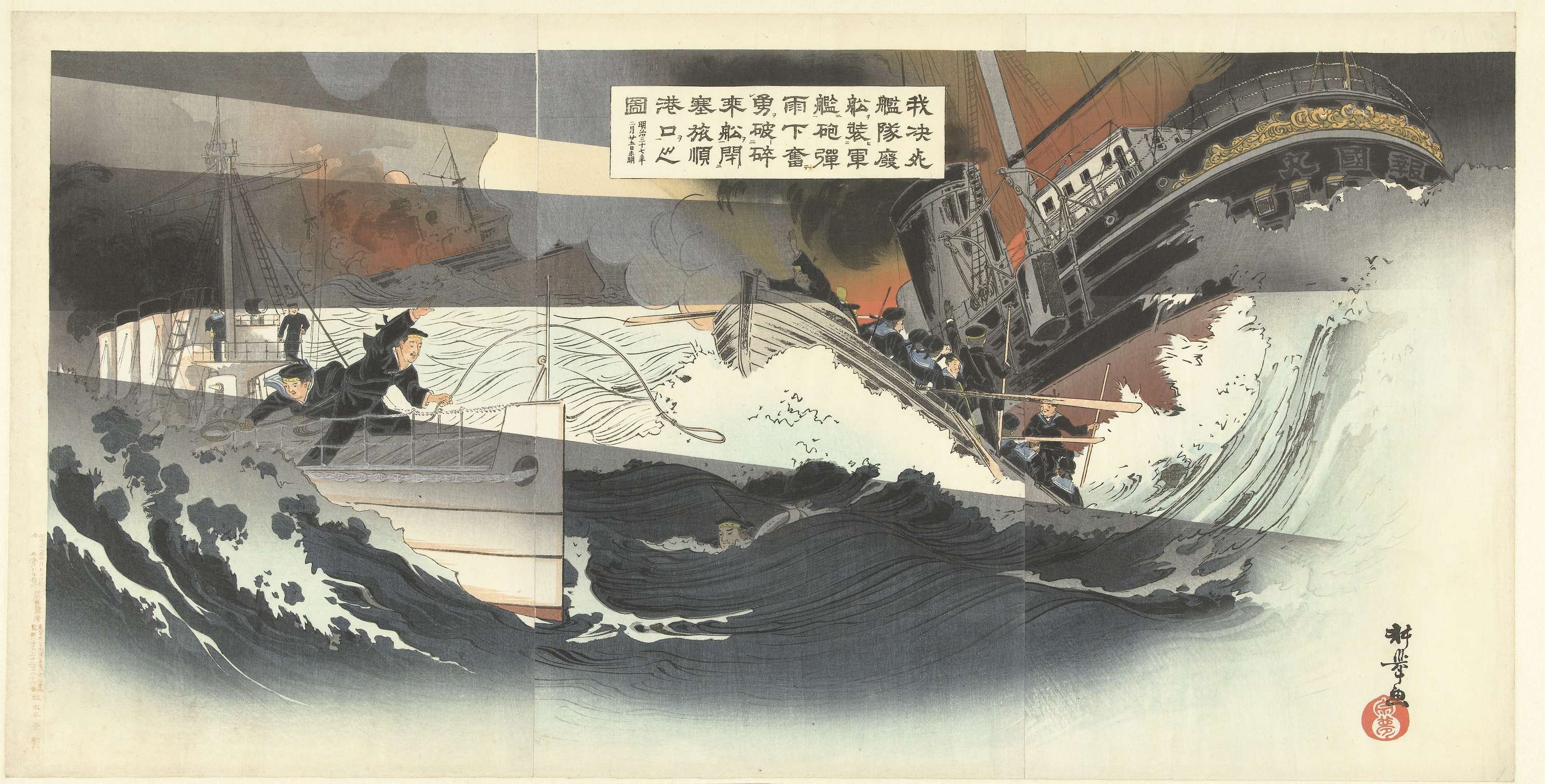 Onze dappere mariniers, in vaartuigen gecamoufleerd als oorlogsschepen, laten heldhaftig onder een kogelregen hun schepen zinken om de toegang tot Port Arthur te blokkeren.