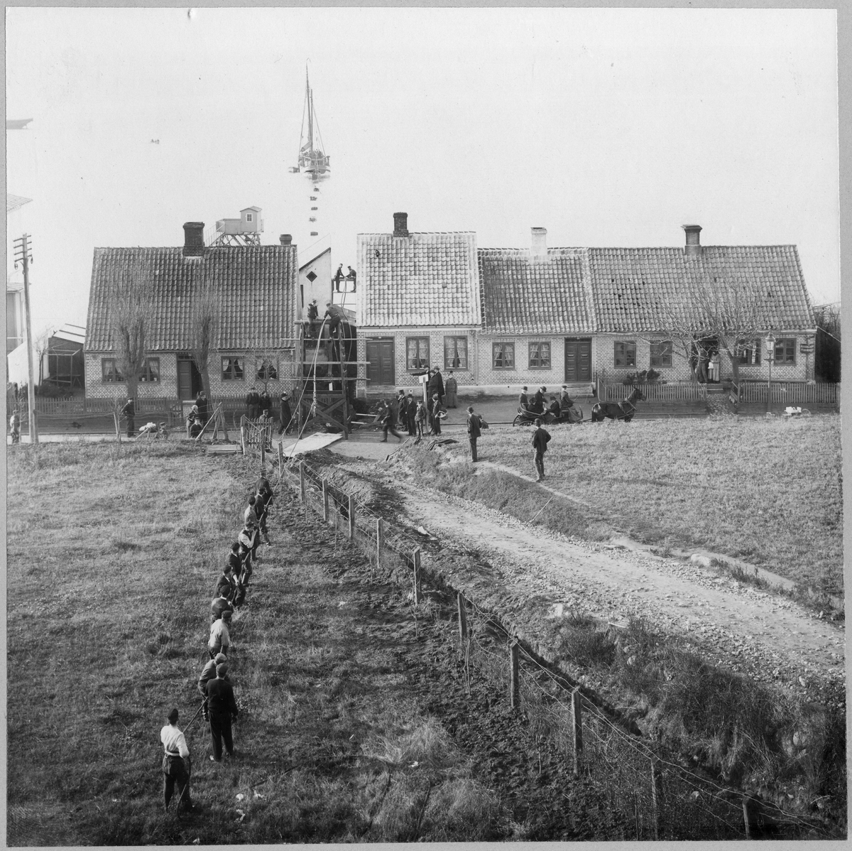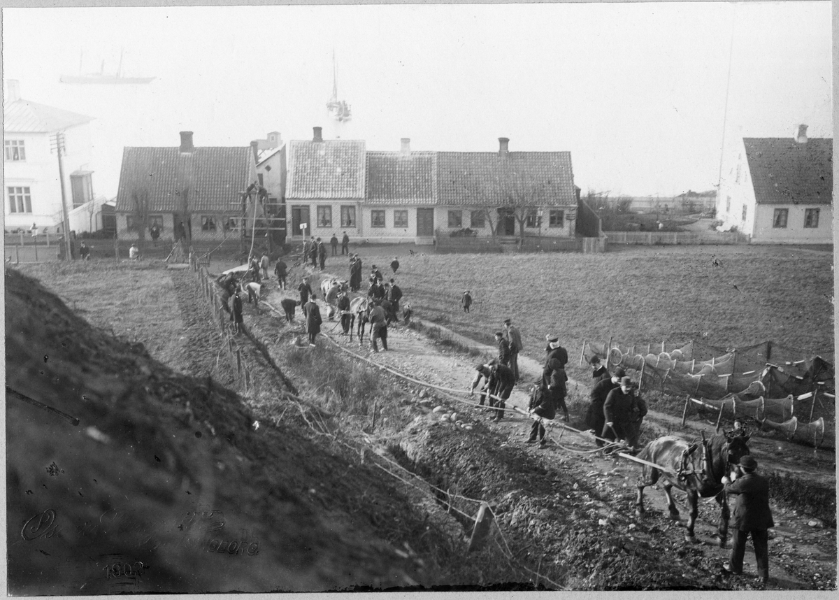 Första telefonkabeln direkt i Hälsingborg (Helsingborg)- Helsingör, 5/11 1902. Hästar drar upp kabeln.