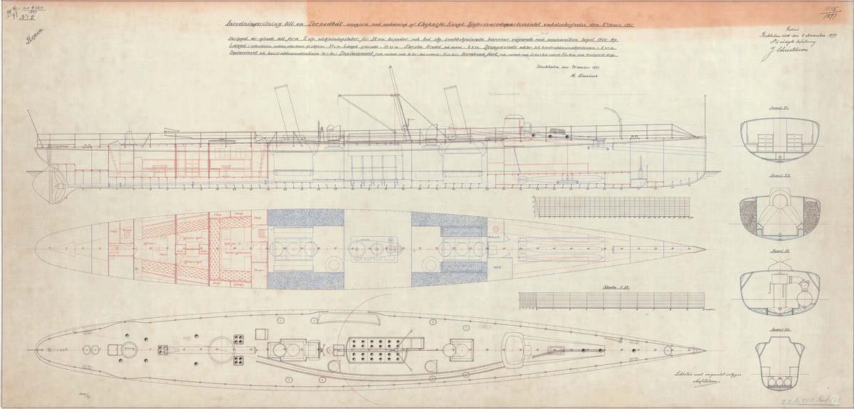 Buffalo (1813). Scale: probably 1:96. Plans showing incomplete inboard profile, quarter deck, forecastle deck, upper deck, and lower deck with alterations in green ink for fitting the Buffalo (1813), a purchased East Indiaman, converted to a Storeship.