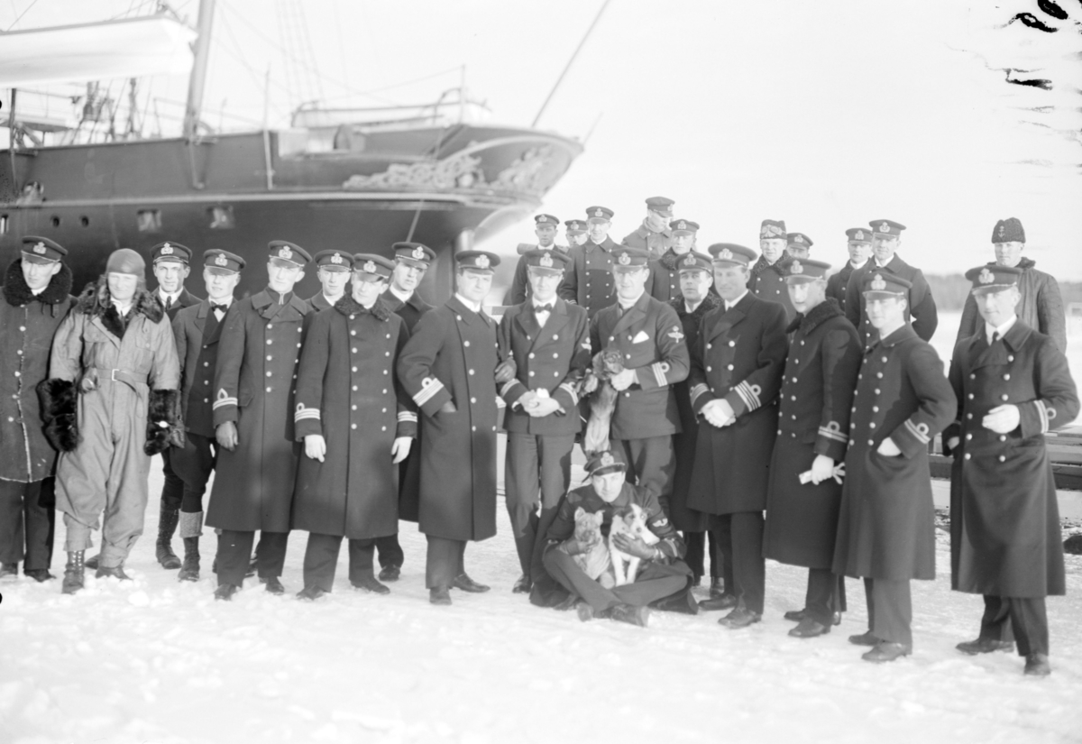 Grupporträtt av officerare vid Kungliga Sjökrigsskolan vid besök på Hägernäs flygstation, 1923.