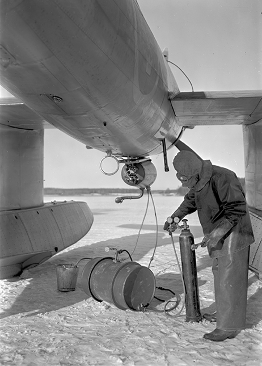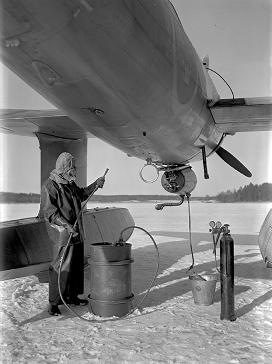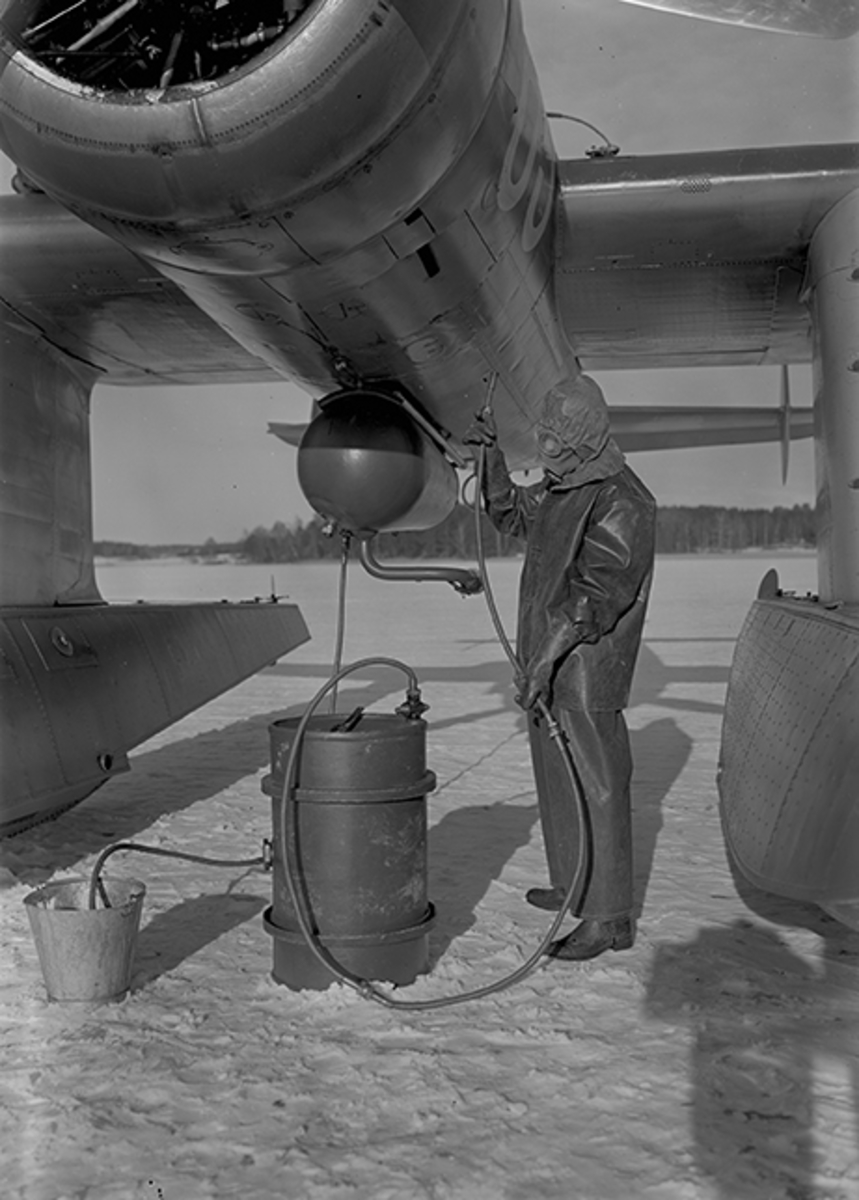 Påfyllning av dimbildare på flygplan S 17. Slang från tunna ansluts till flygplanet.