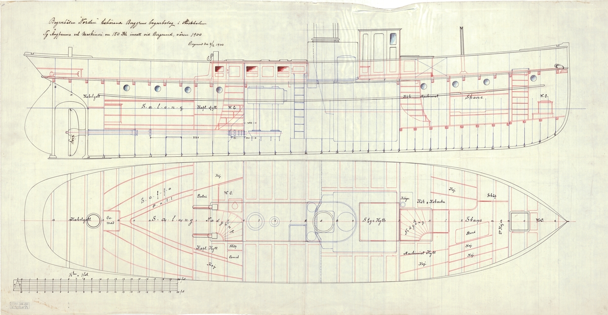 Proposed (and approved) alterations are drafted in red ink, illustrating a plan to use the 'Warrior' as a depot/store sh