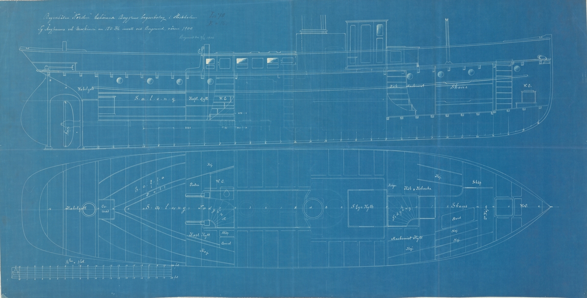 The loaded waterline and existing ladderways are picked out in blue ink, while proposed (and approved) alterations are draft