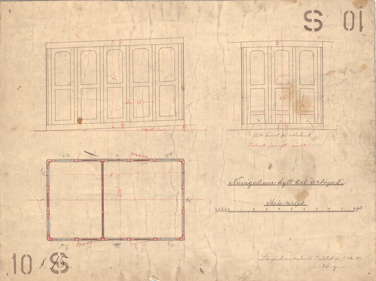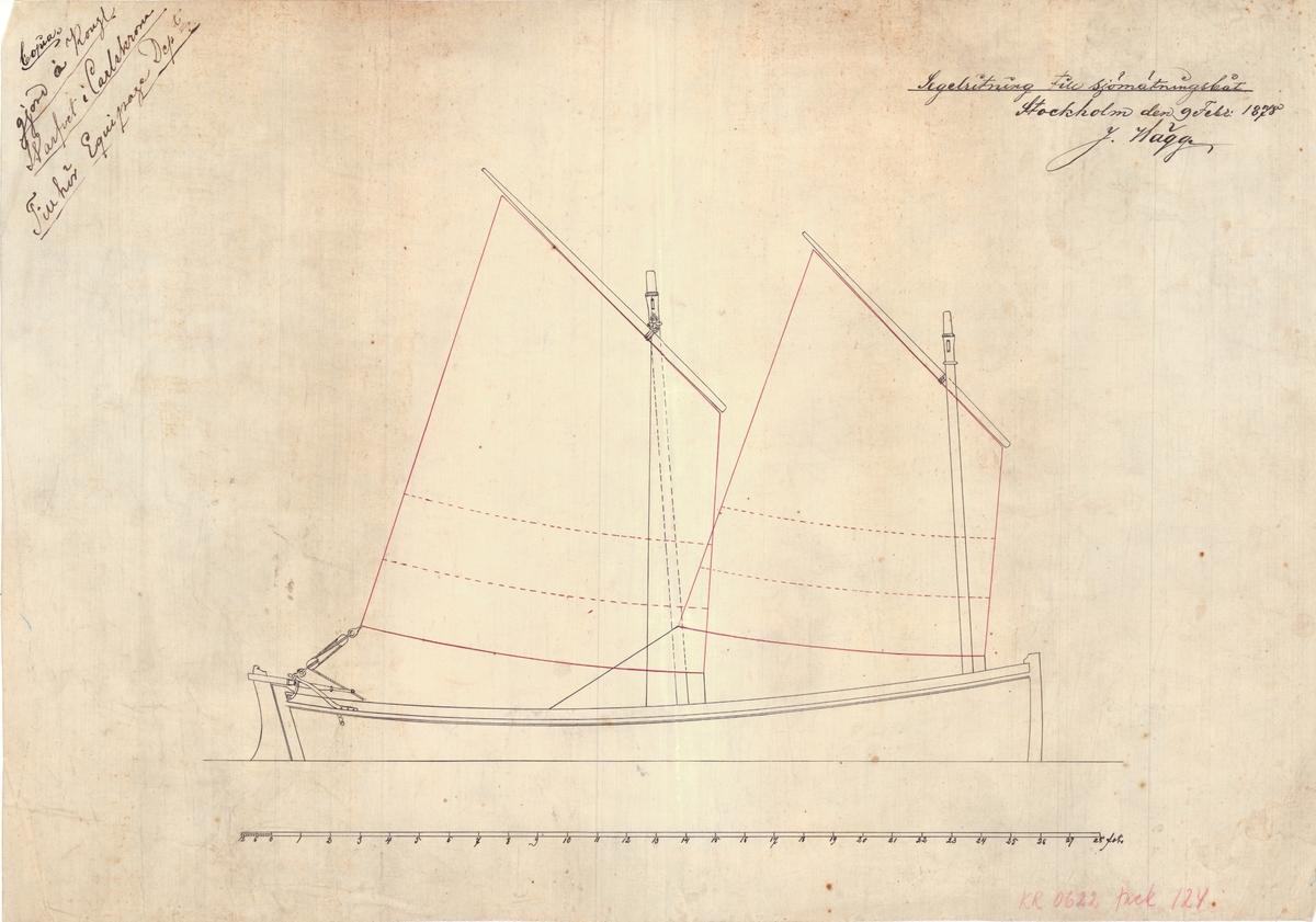 23ft Launch for HMS Texel (1799). No scale. Plan showing the profile, rigging and sails, and section, and sheer legs for lowering a cannon onto the 23ft launch of the Texel (1799) a 64-gun Third Rate converted to a Floating Battery. The plan also shows