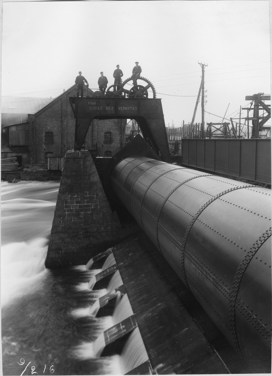Ombyggnad av Trollhätte kanal, Trollhättan. Valsen i regleringsdammens östra öppning efter färdigställandet i februari 1916.