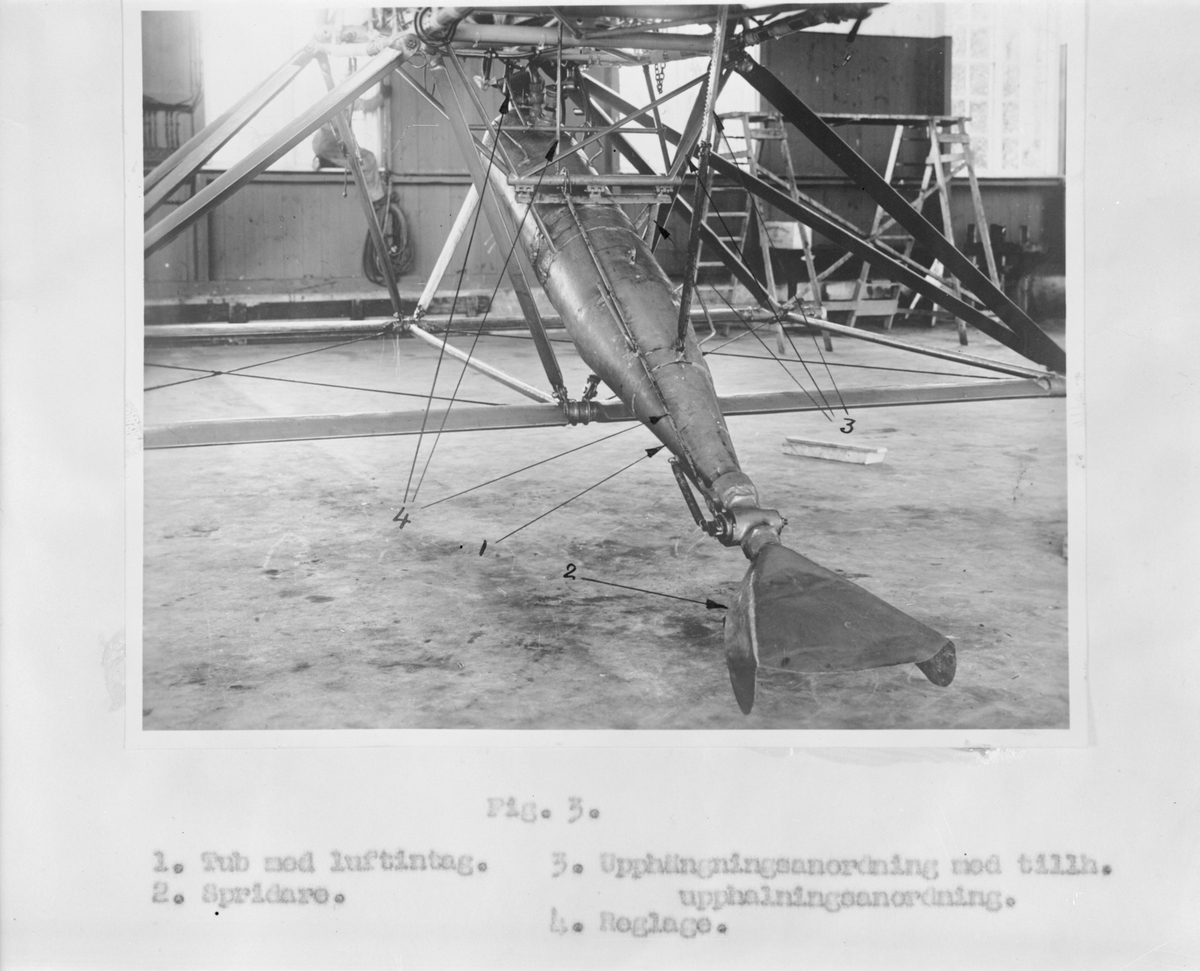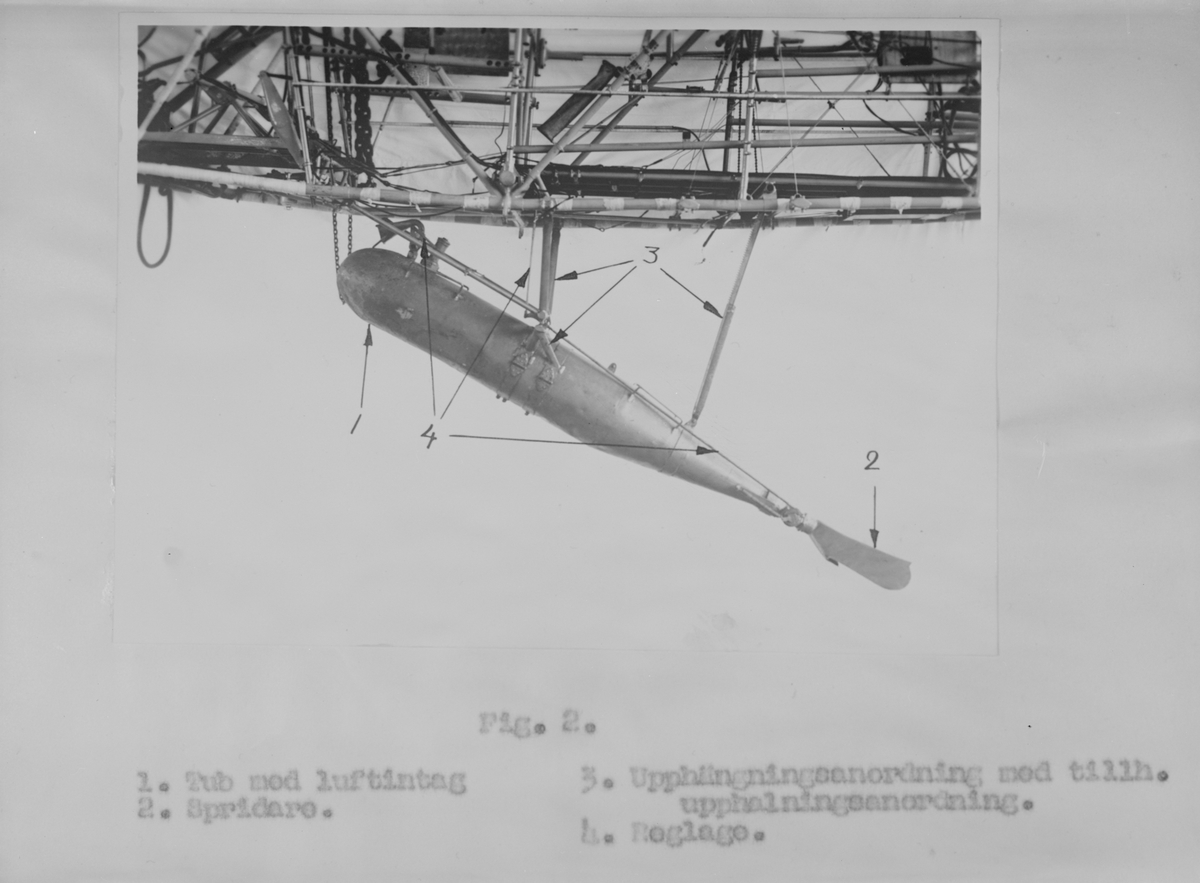 Dimbildare till flygplan, närbild av upphängning och beskrivning av delar.