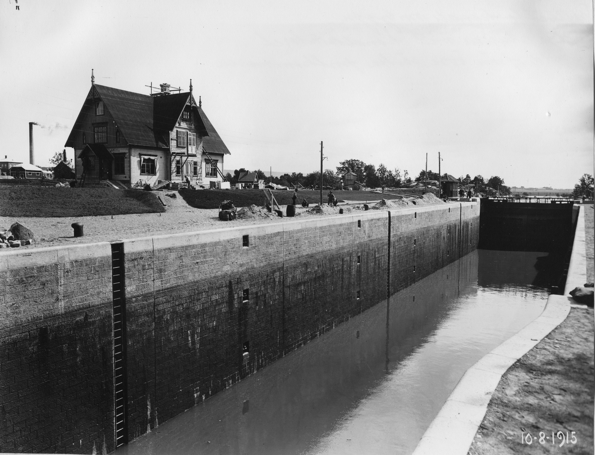 Ombyggnad av Trollhätte kanal, Trollhättan. Nya slussen med kanalkontoret dess från övre västra portkammaren.