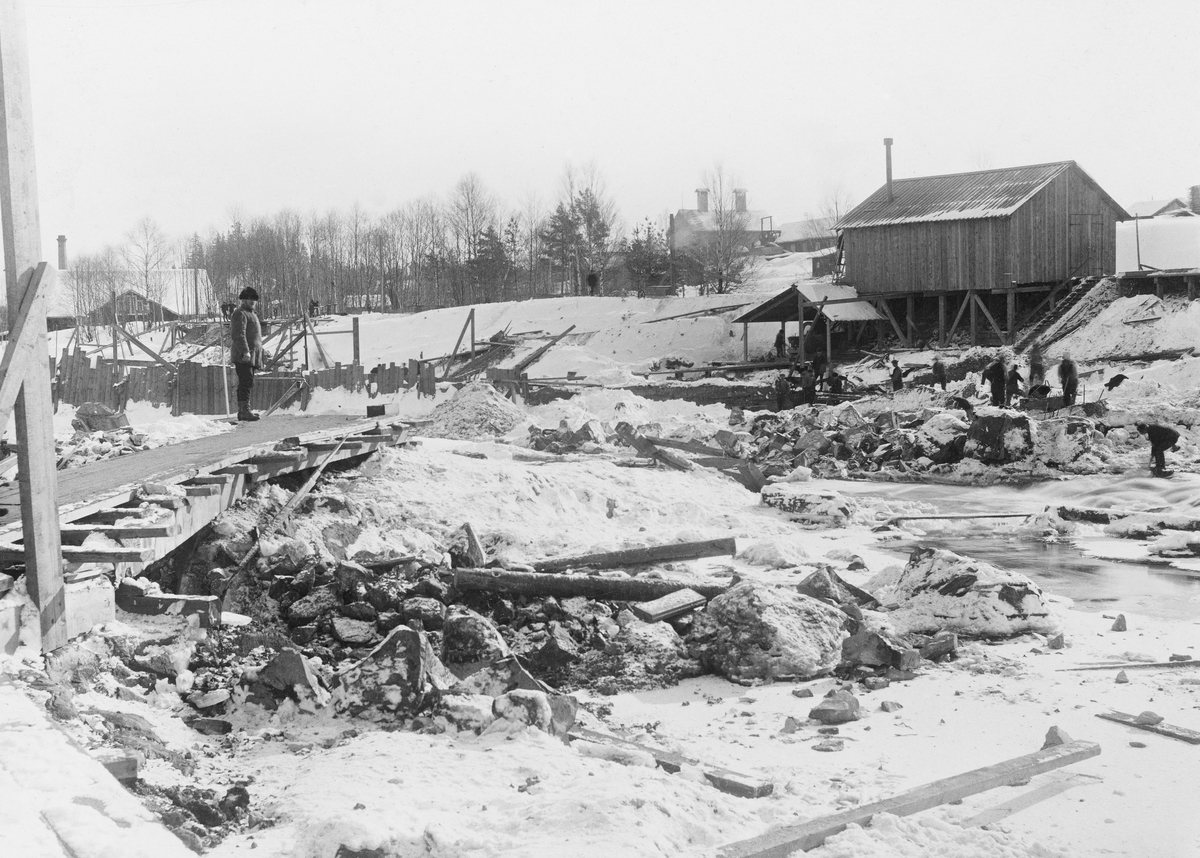 Avesta Lillfors kraftverk. Tilloppskanalen åt sydost från yttre fördammen i älven. Byggnaden till höger inrymmer lokomobil för makadamkrossning och uppfordringsspel.