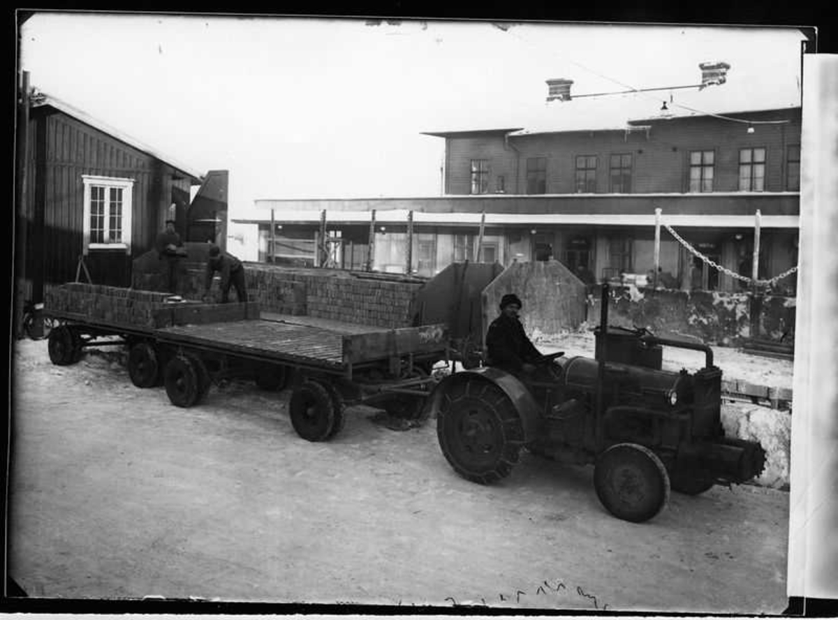 Traktor med 2 vagnar, lastning av tegelsten på järnvägsvagn, Järnvägsstationen Vänersborg
