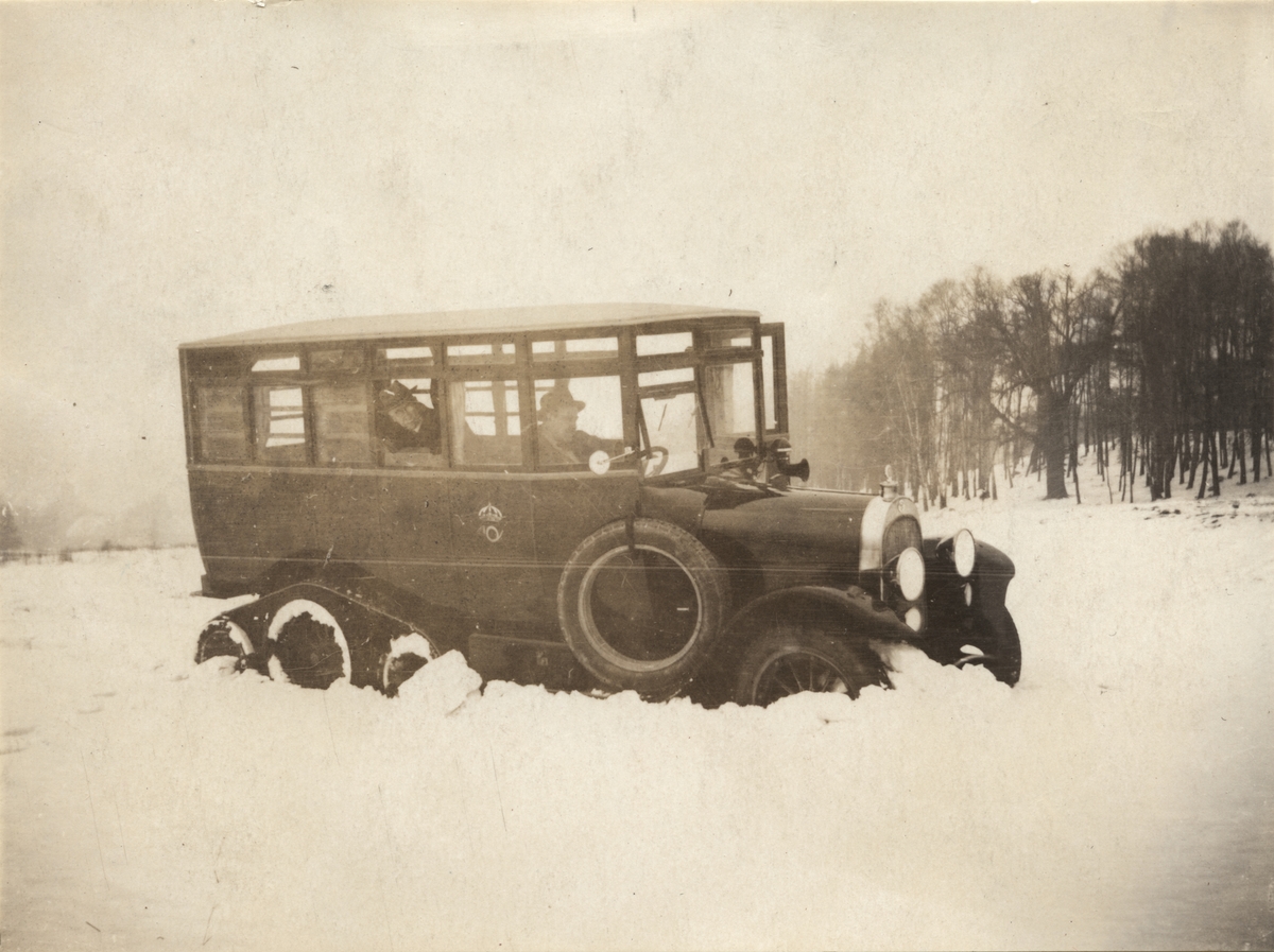 Prov med postbuss på skidor på Ladugårdsgärdet den 12 januari 1924. Vid ratten Thorsén. I bussen Generaldirektör Juhlin.