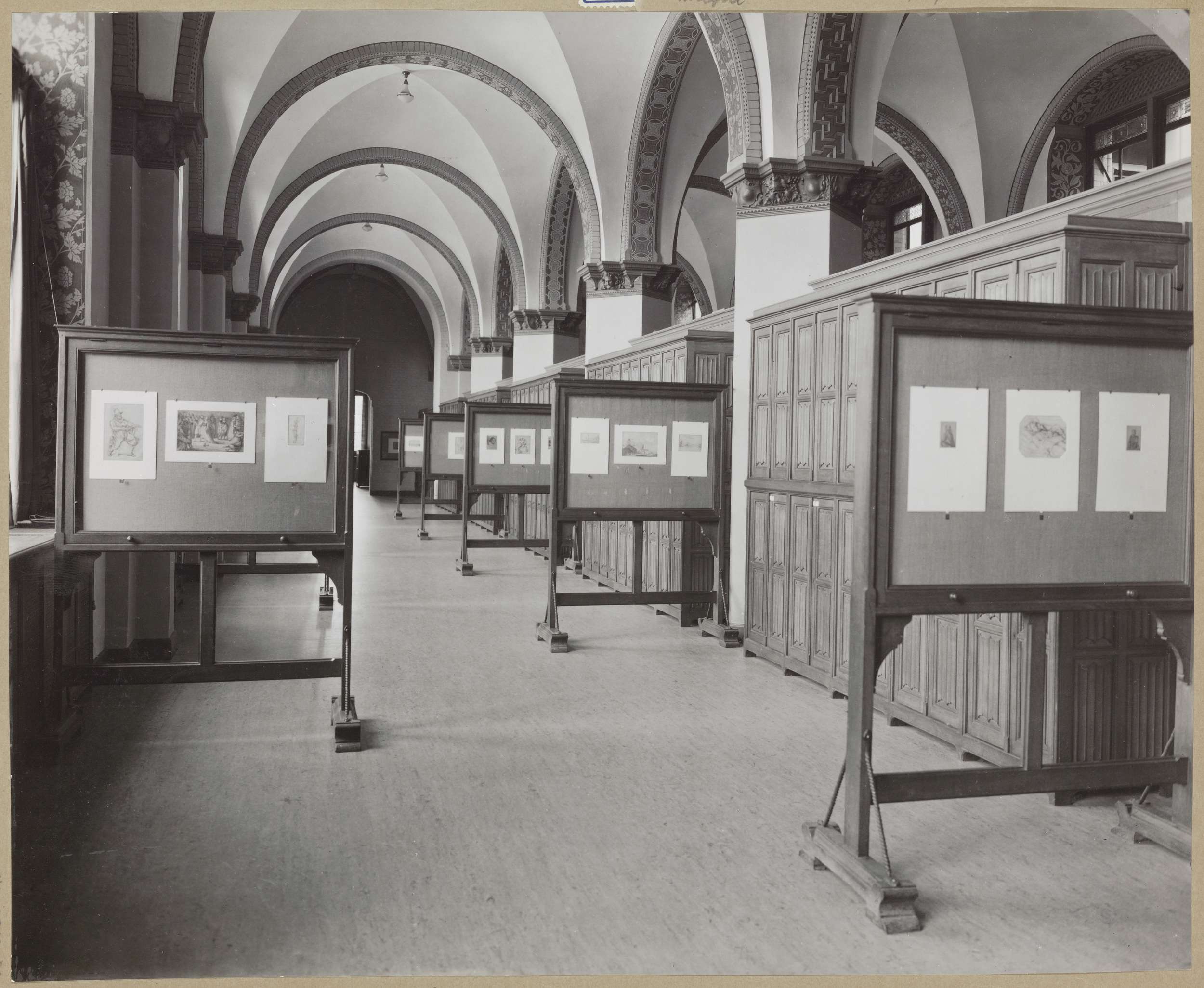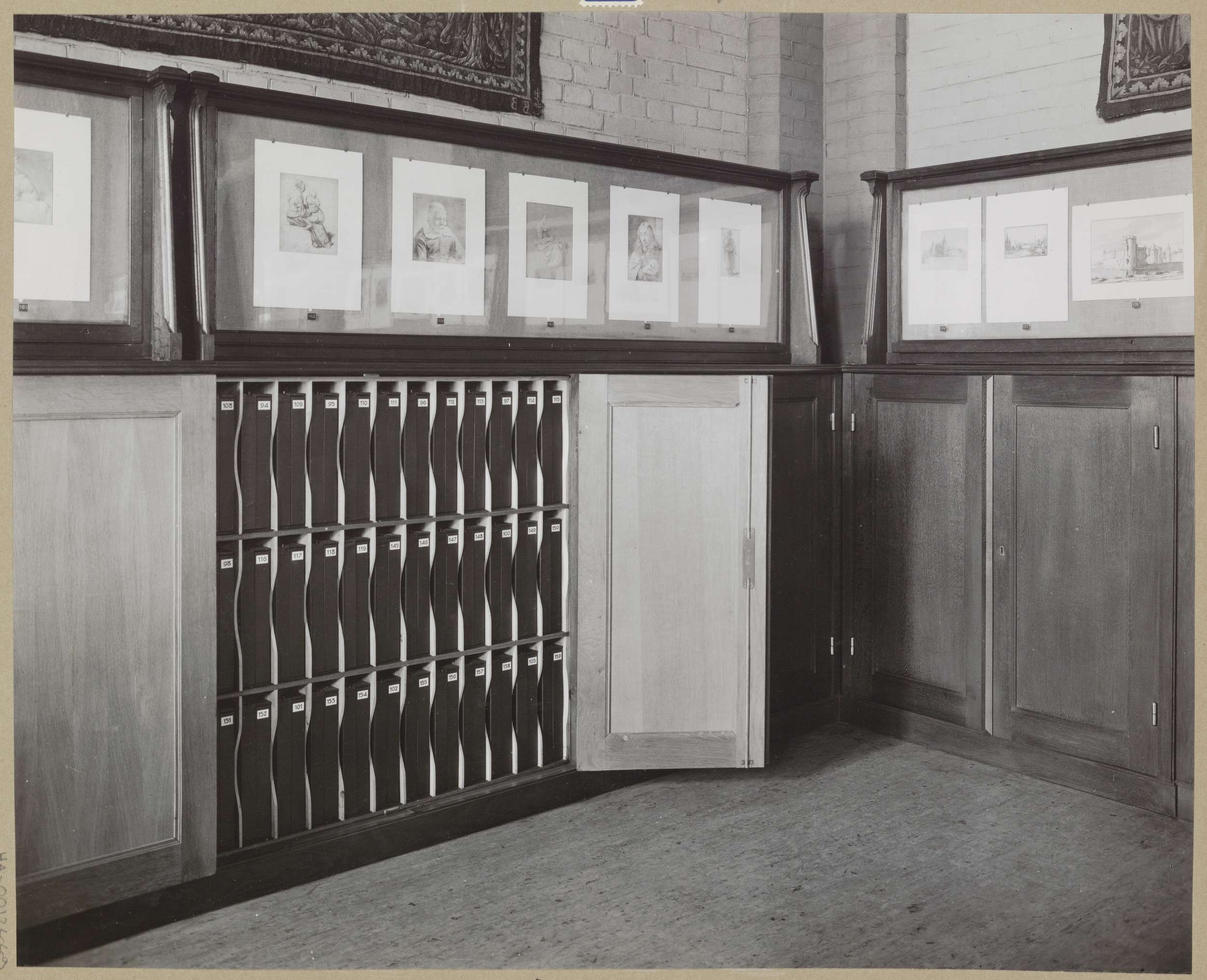 Hoek van zaal met tekeningen in vitrines en daaronder kasten met opbergdozen voor tekeningen of prenten