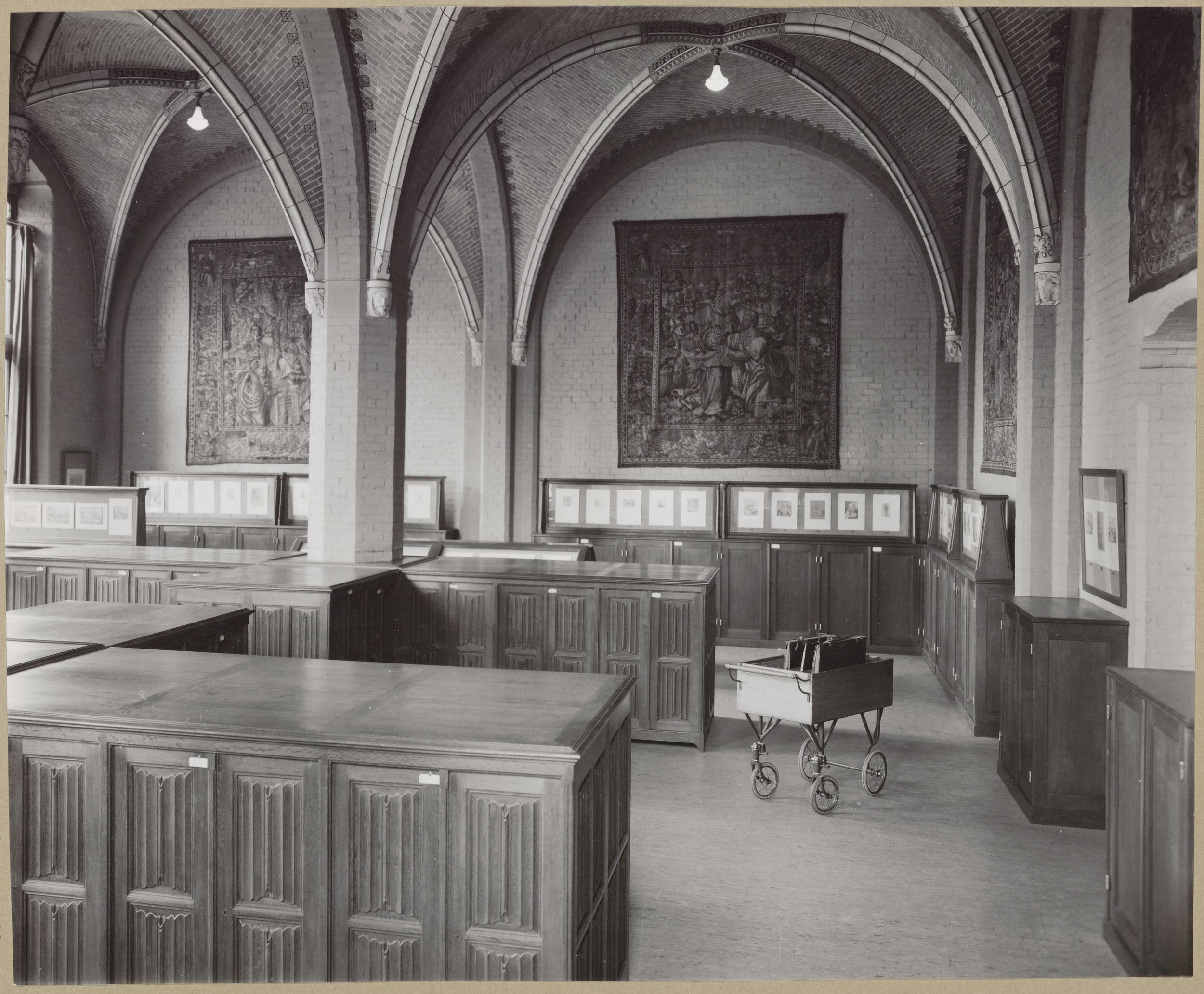 Zaal van het Rijksprentenkabinet met halfhoge kasten, tekeningen in vitrines en wandtapijten