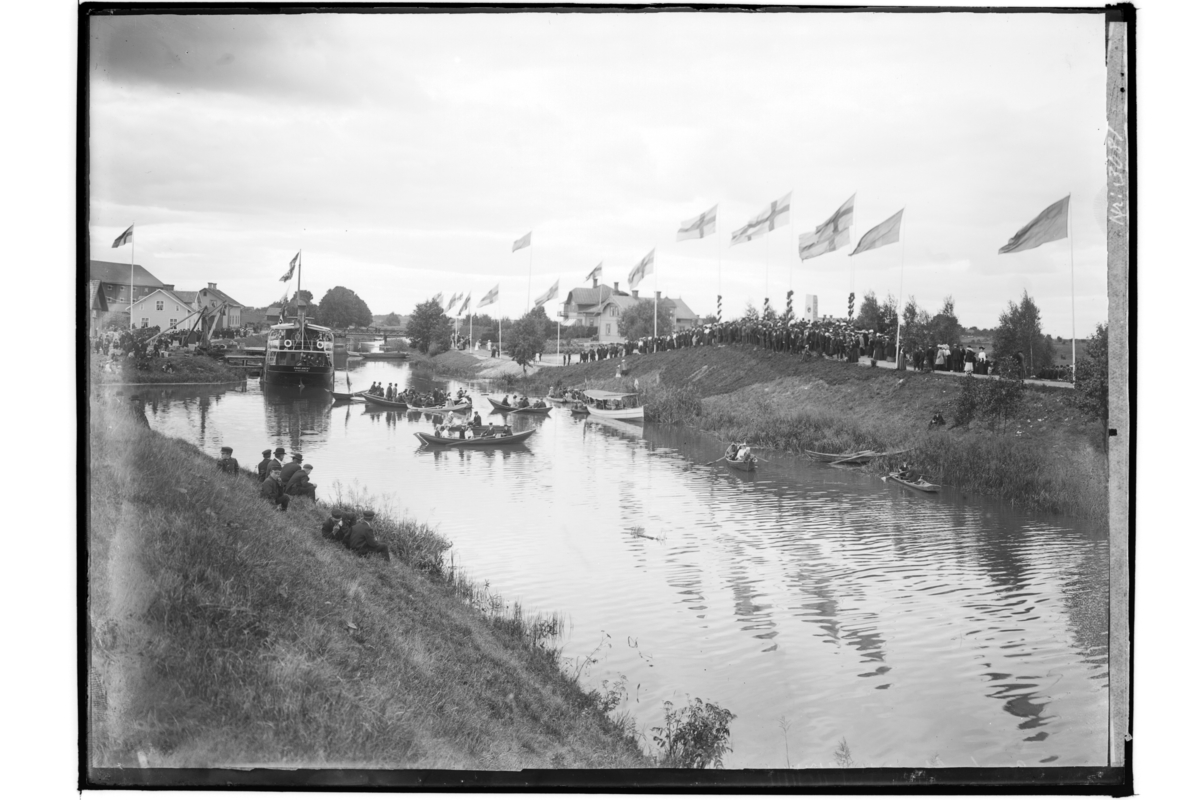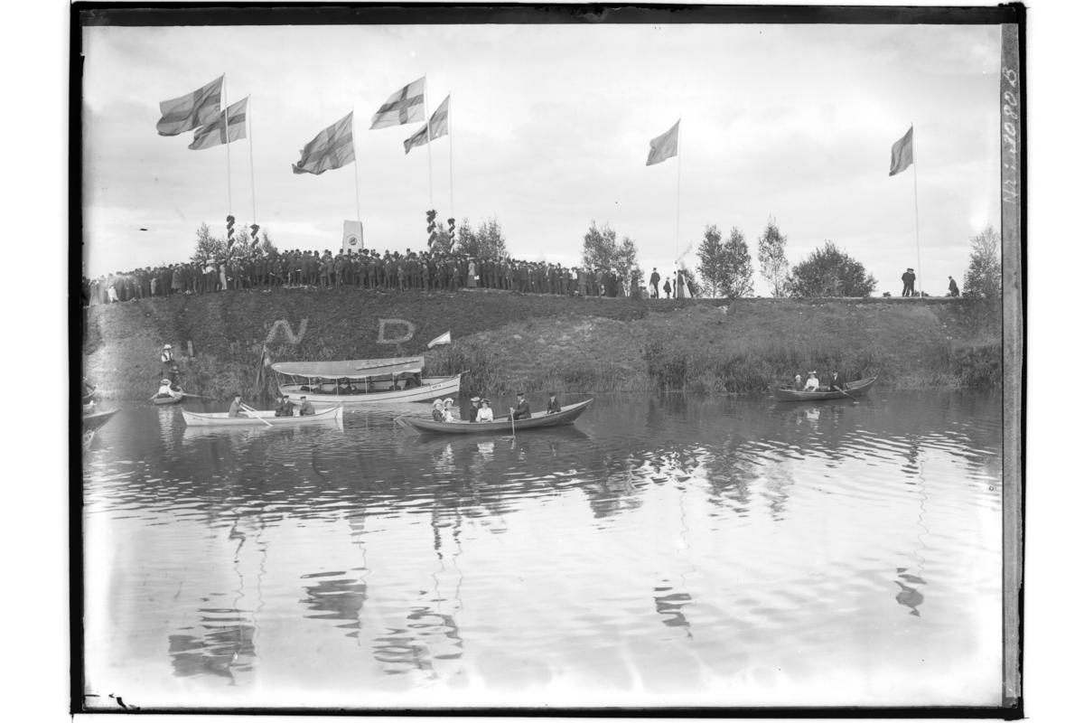 Djurklous monuments avtäckning vid Odensbacken. Roddbåtar och människor.