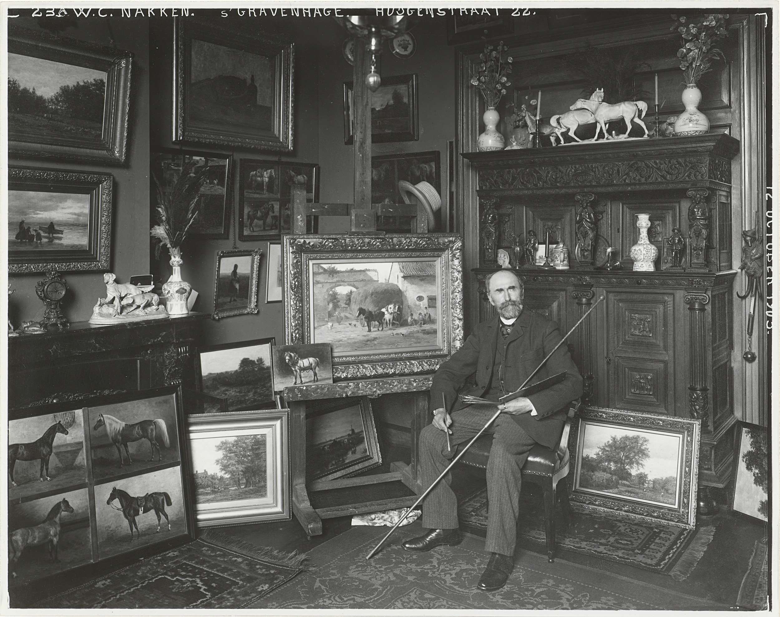 De schilder J.J. van de Sande Bakhuyzen in zijn atelier op de Huijgenstraat 19 in Den Haag