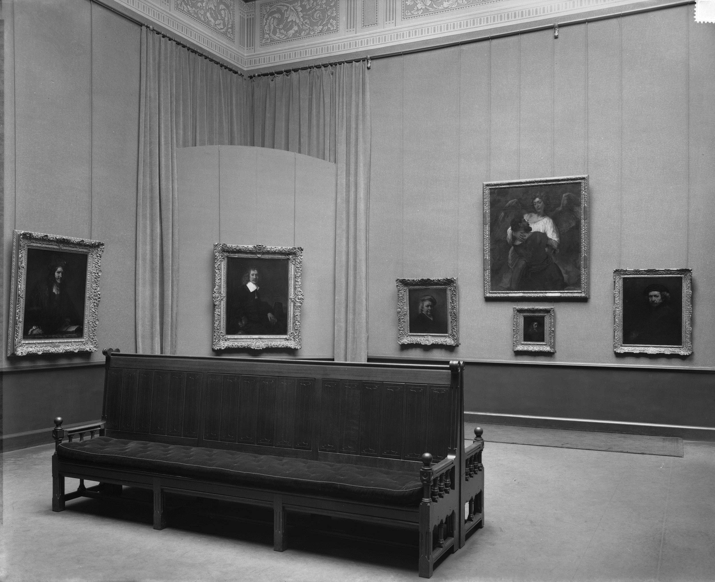 Hoek van een zaal met schilderijen, gordijnen en twee tegen elkaar staande banken