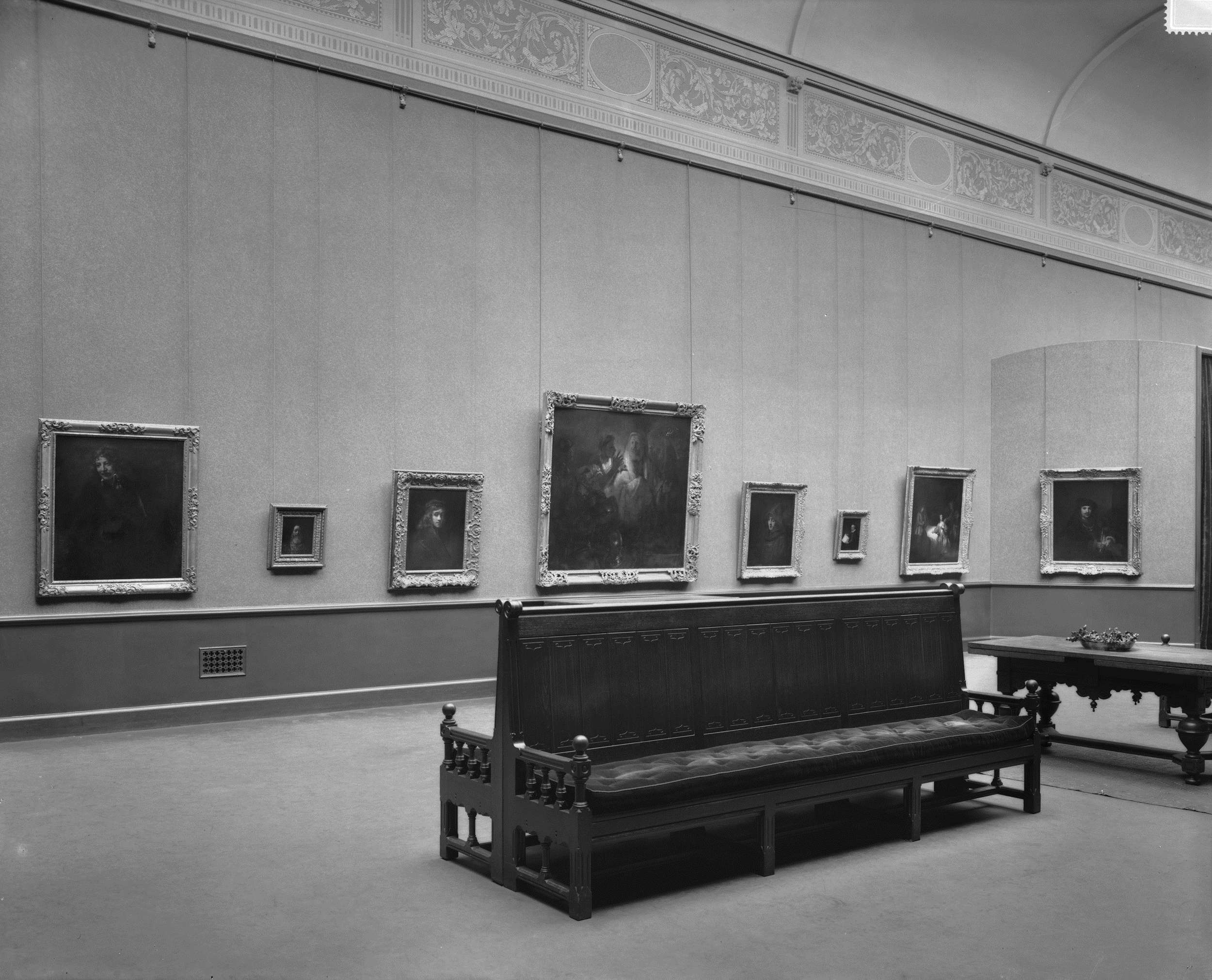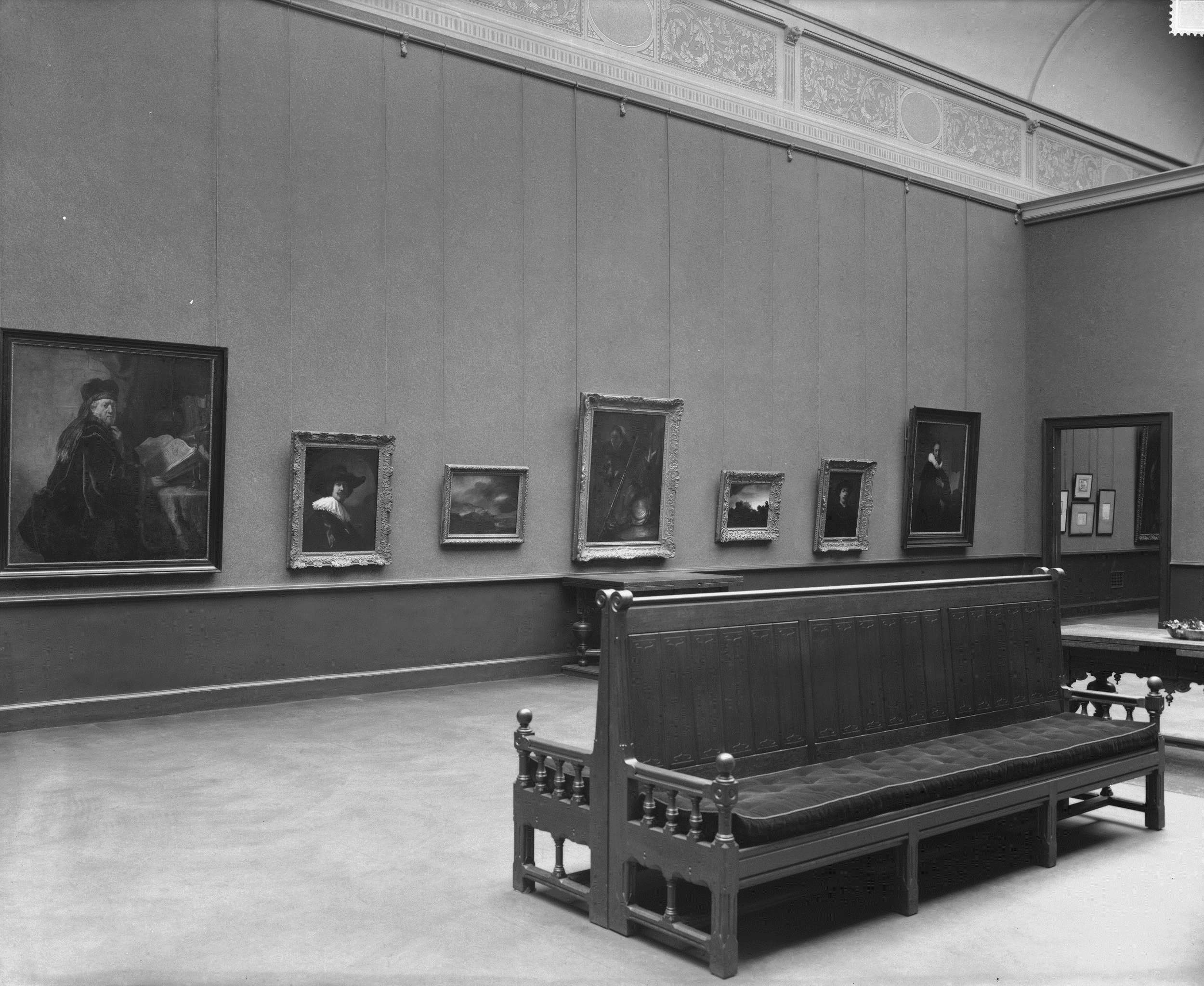 Zaal met schilderijen, twee tafels, twee tegen elkaar staande banken en een doorgang rechts