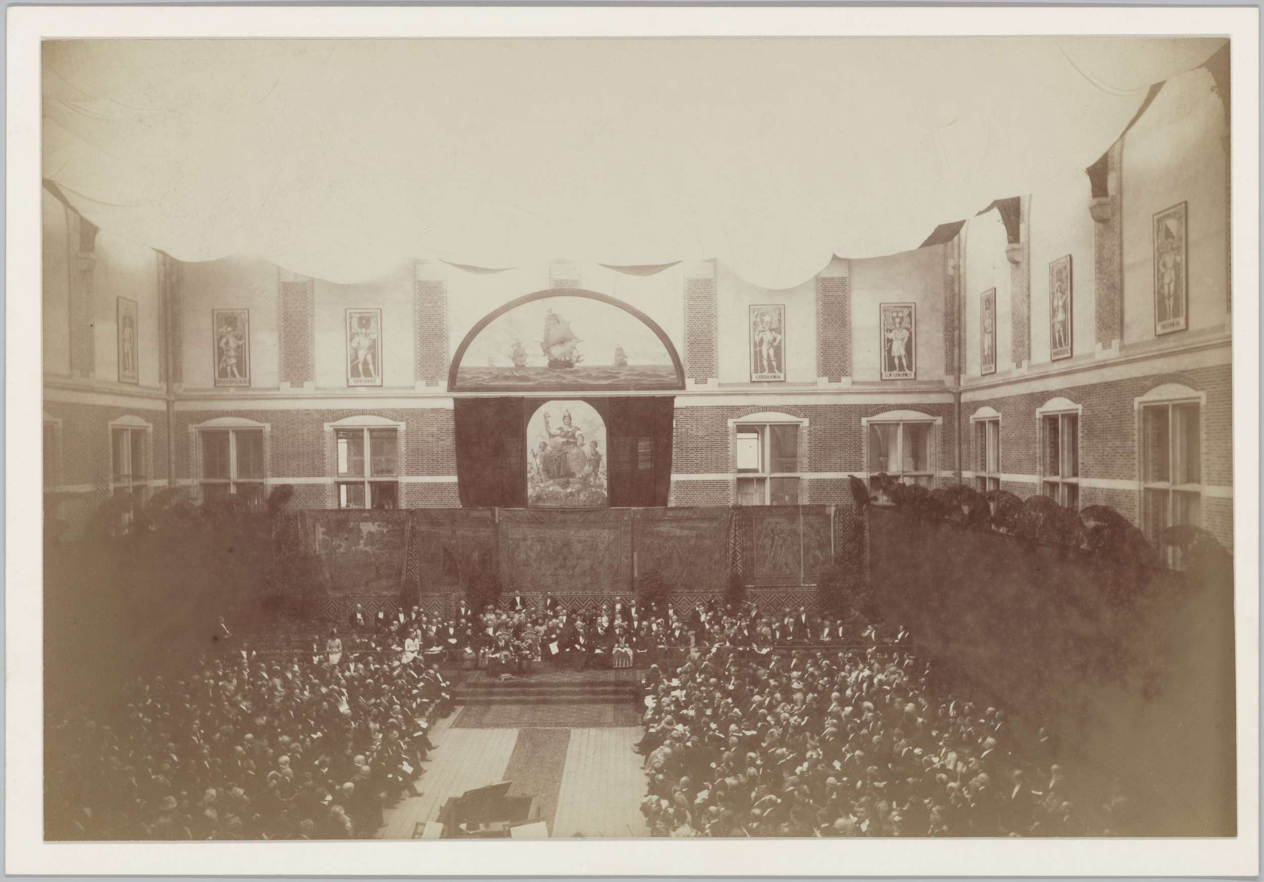 Inrichting oostelijke binnenplaats voor openingsceremonie van het Rijksmuseum