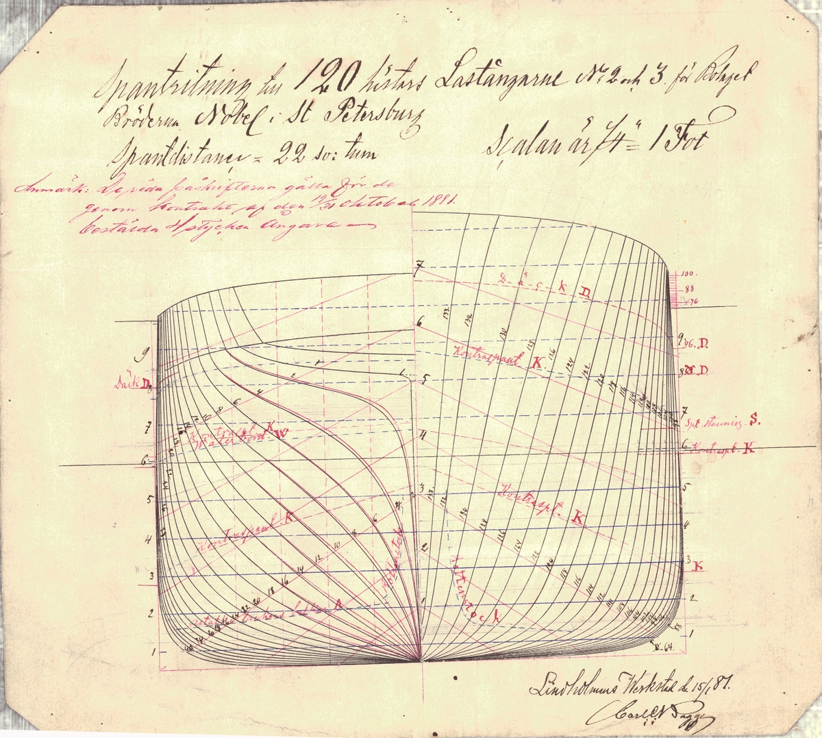 Dreadnought (1875). Scale 1:48. A sheer drawing of the body plan, waterlines, half-breadths, as redesigned in conformity with arrangements approved 11 Sept 1872, for the turret battleship HMS Fury (renamed Dreadnought, 1875) while under construction. Con