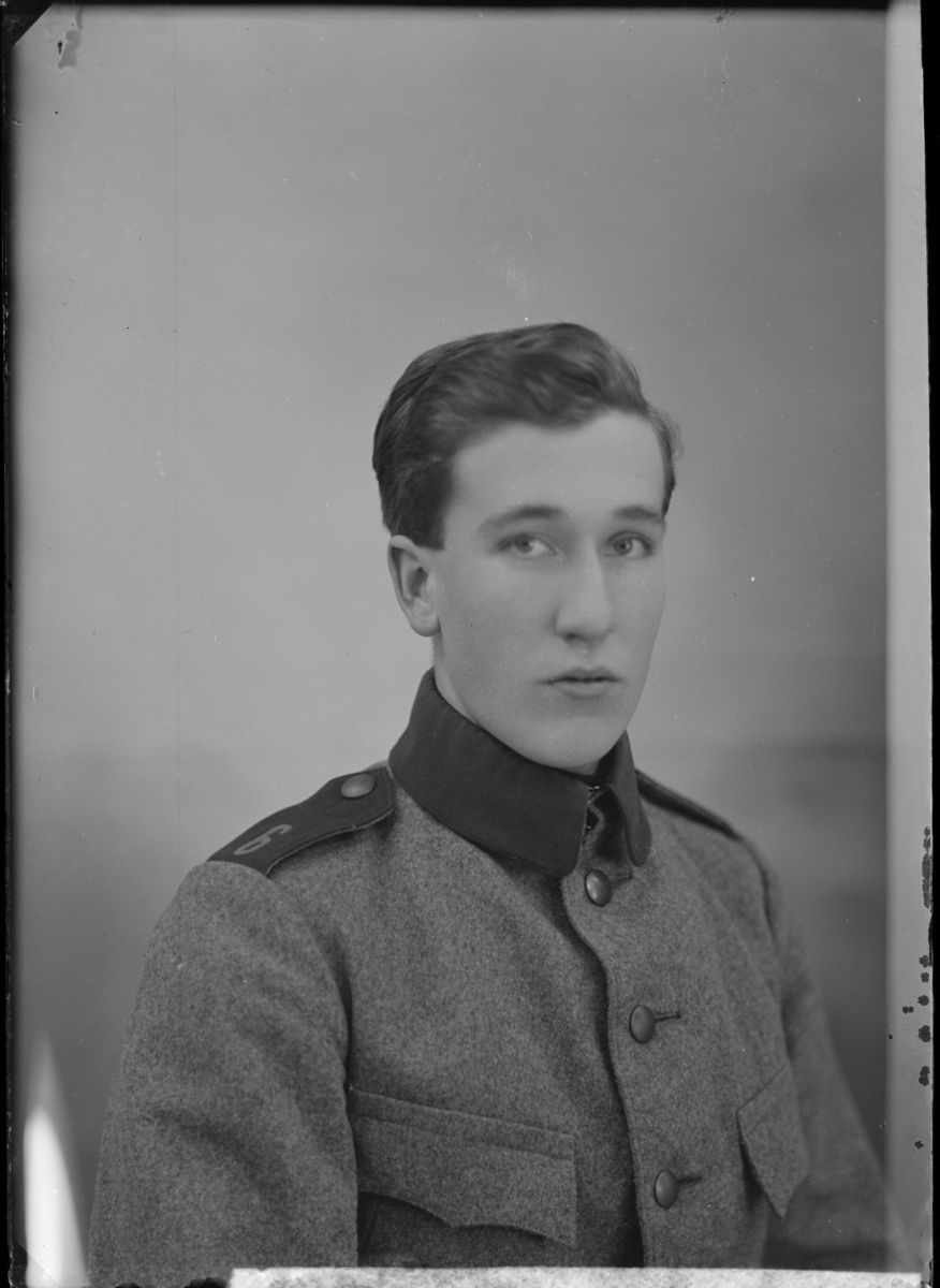Tegen een neutrale achterwand poseren twee militairen, een vrouw en een kind. De man links op de foto is Ferdinand Suls. Hij zit achter een zwart bord waar met wit krijt het volgende geschreven staat: Bezoek van mijn Vrouw te Harderwijk 15-1-1915. Hij hee