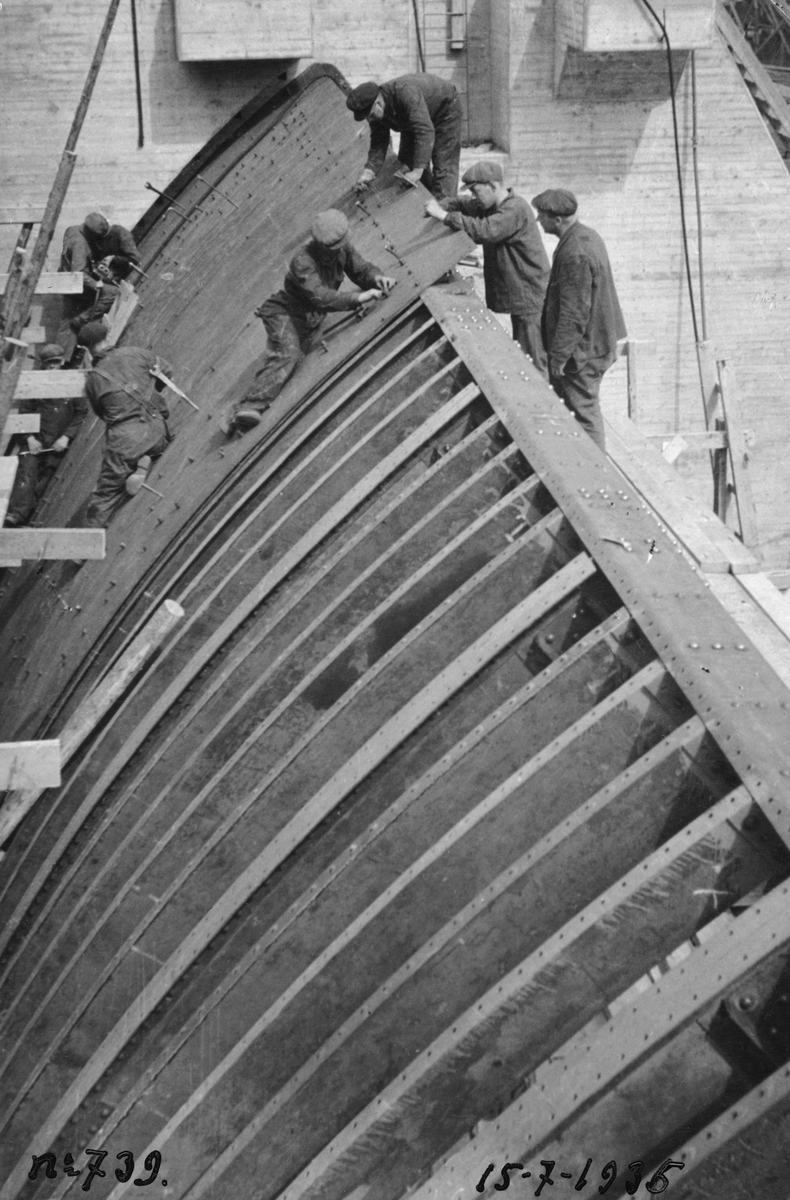 Den 15 - 19 juli 1897. På landningsplatsen, arbete med montering av båtens stomme. Framtagning av bilderna gjordes av docent John Hertzberg år 1930 på Fotografi, Tekniska Högskolan.