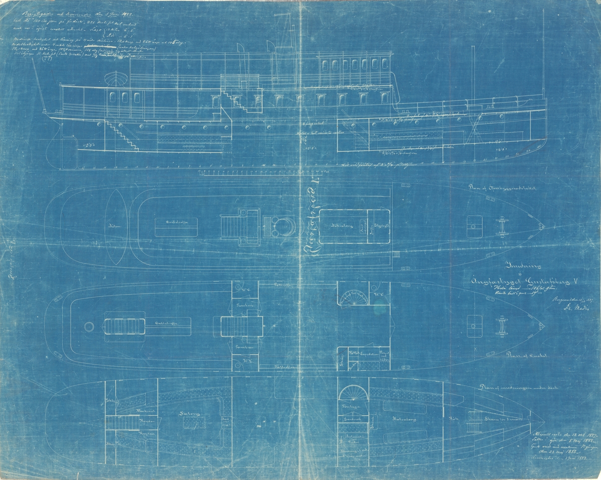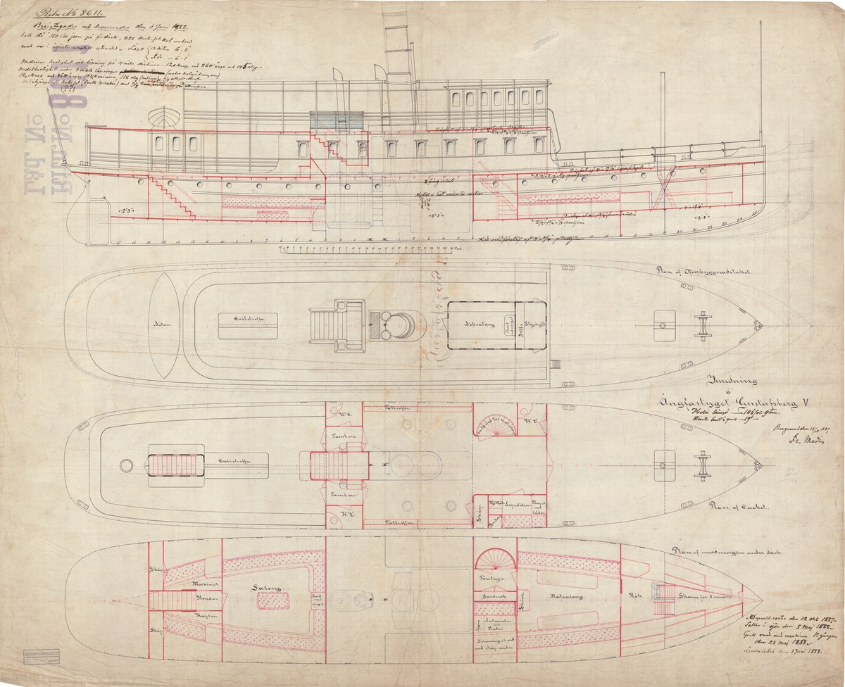 32 ft Pinnace. Scale: 1:24. Plan showing the sail elevation with some inboard detail for a 14 oared, 32 ft Pinnace woth a De Horsey Rig. Signed E. C. Warren [Chief Constructor, Chatham Dockyard], and H. S. Ley [Staff Captain, Chatham Dockyard].