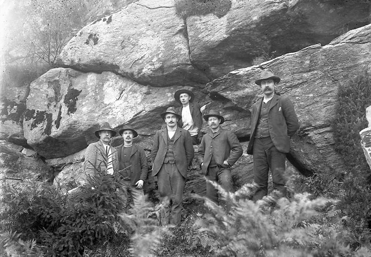 Enligt fotografens notering: "Nordqvists lag, "Skräddarenäsa" Hellungen. Den 15 okt 1904 (i regnväder). Bakom de andra synes Jär