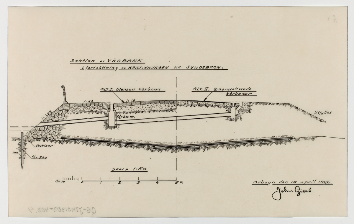 Ritning av sektion av vägbank i fortsättning av Kristinavägen till Sundbron.