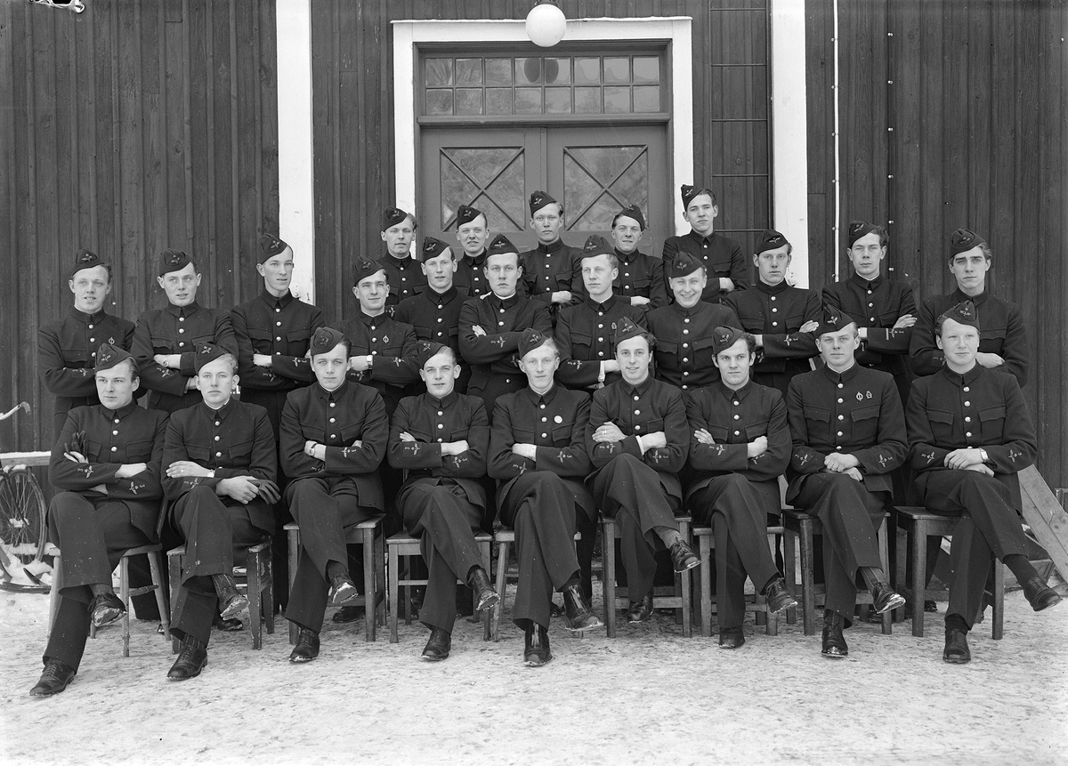 Elever vid 1940 årsklass, höstgrupp, på F 3 Östgöta flygflottilj. Grupporträtt framför byggnad på Malmen.