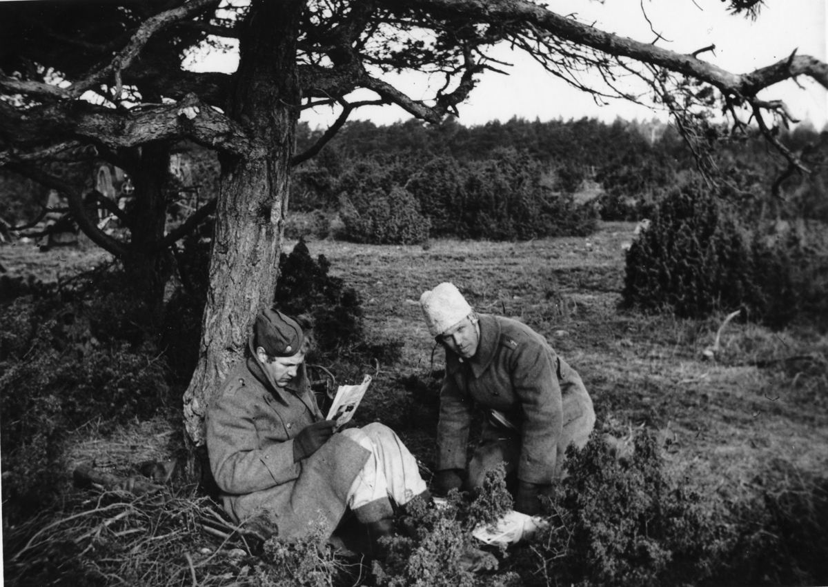 Elever vid korpralskolan på F 3 Östgöta flygflottilj, 1943. Grupporträtt framför byggnad.