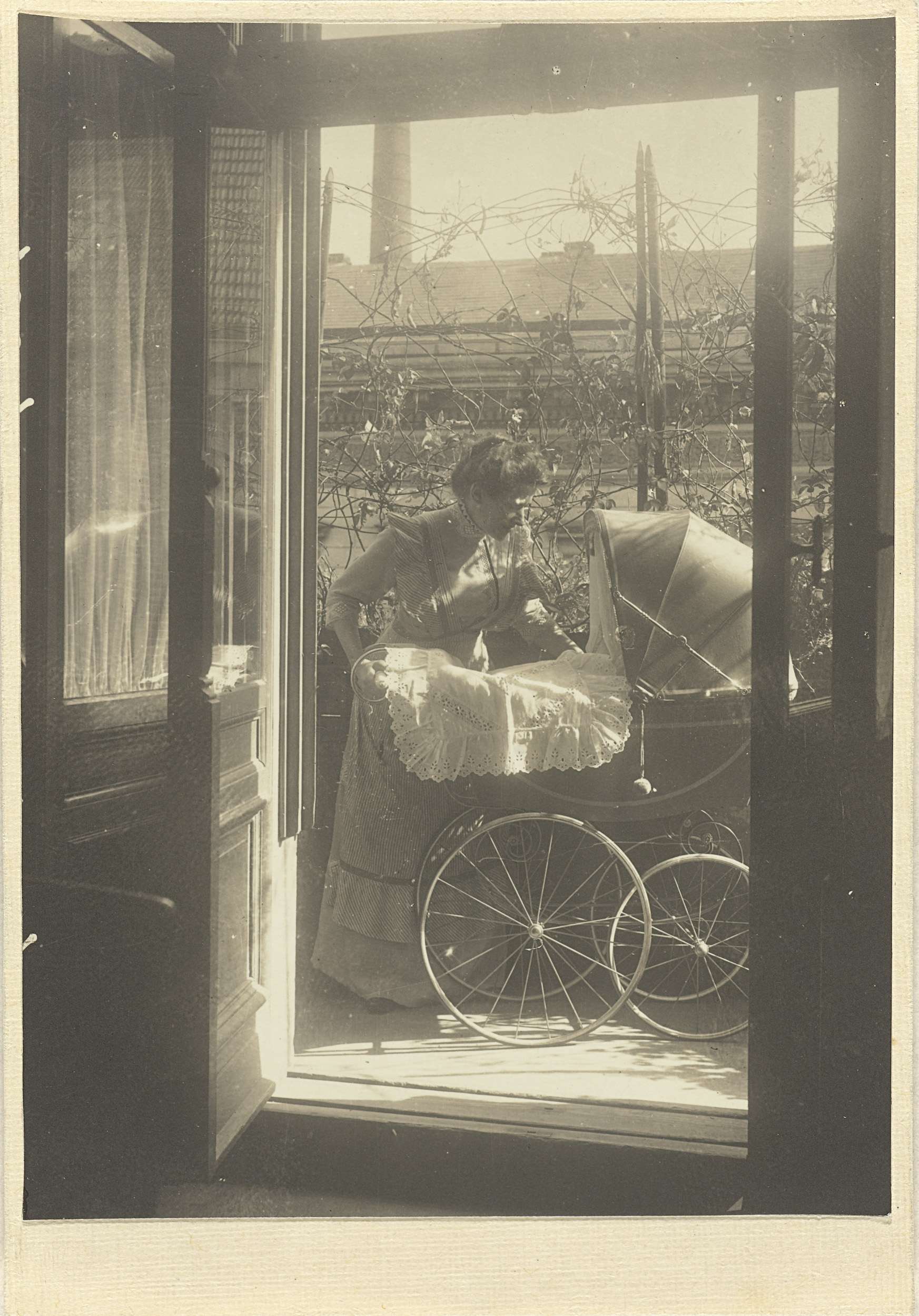 Onbekende vrouw staand bij een kinderwagen , op een balkon van het woonhuis Friedrichstrasse, Berlijn