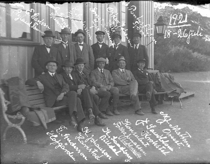 Skrivet på bilden: "1921 1826 juli. E. Carlsson, Ryland Tanum. A. Svensson, Spekeröd. S. Andersson, Hjärtum. Ernst K...mann,Lyse. Oskar Johansson, Skee. Pontus Olsson, Tjörn. G. Andersson, hofgården. K. Johansson, Harestad.