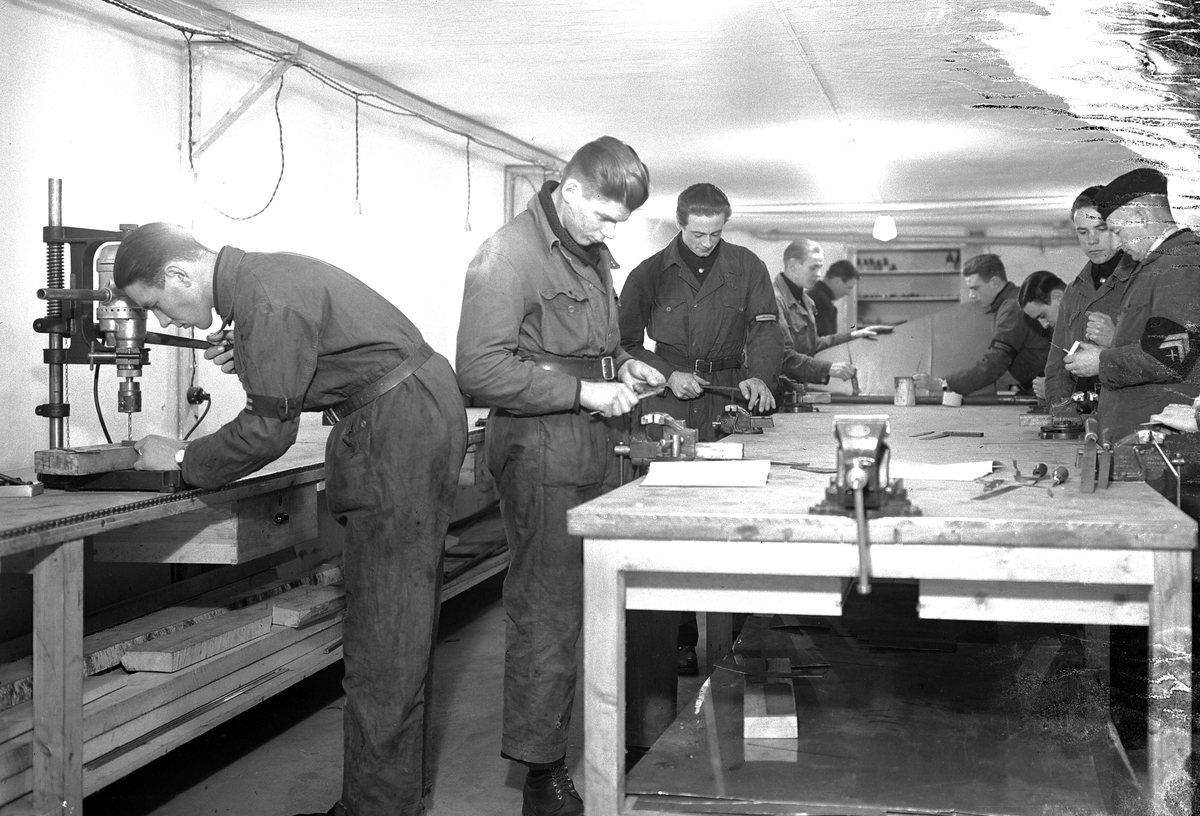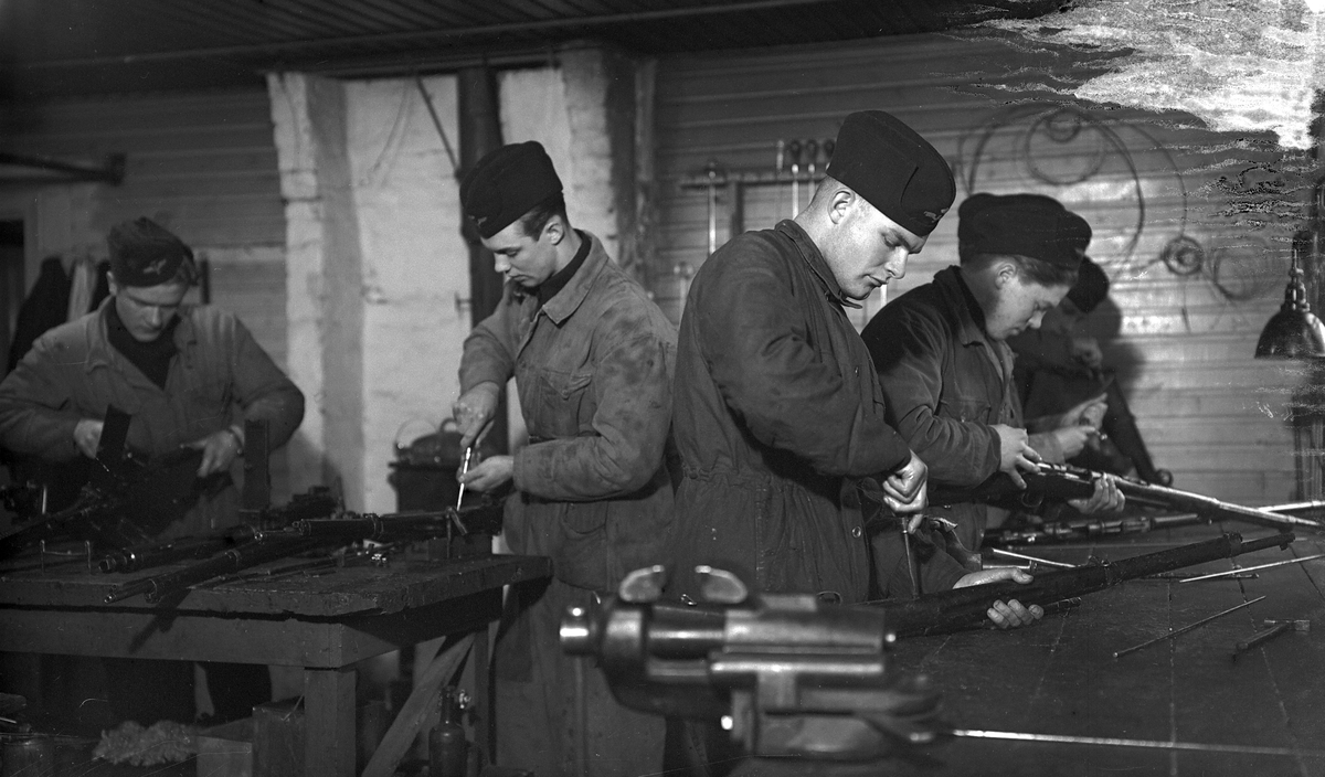 Elever i arbete med vapen i vapenverkstad i kasern I, under lektion på F 2 Roslagens flygflottilj, 1939.